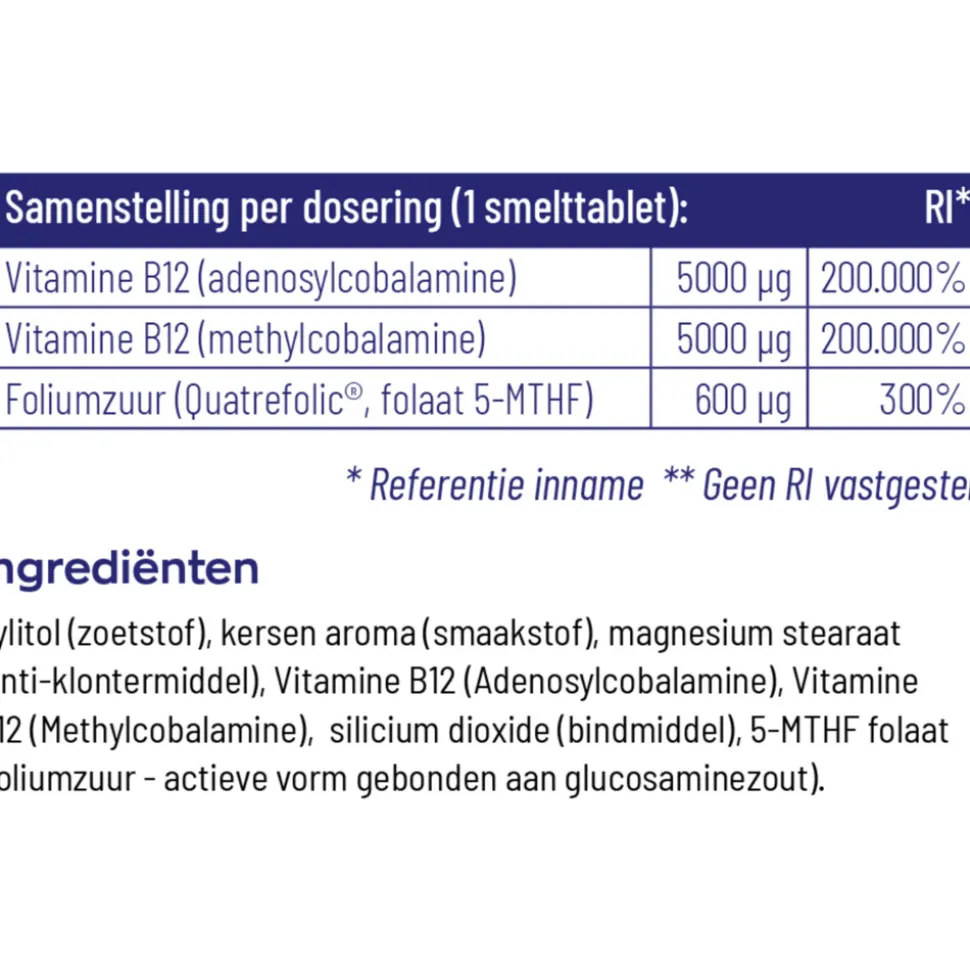 Ingrediënten per smelttablet: Vitamine B12 (adenosylcobalamine) 5000 mcg 200000% RI, Vitamine B12 (methylcobalamine) 5000 mcg 200000% RI, Folaat (5-methyl-tetrahydrofolaat glucosamine zout (Quatrefolic®)) 600 mcg 300% RI Ingrediënten: Actief Vitamine B12 (methylcobalamine), Actief Vitamine B12 (adenosylcobalamine), Actief Folaat (5-methyl-tetrahydrofolaat glucosamine zout) (Quatrefolic), Zoetstof (Xylitol), Smaakstof (Kersenaroma), Antiklontermiddel (Magnesiumstearaat), Bindmiddel (Siliciumdioxide).