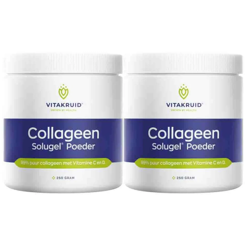Vitakruid Collageen Solugel poeder bevat 99% puur collageen met Vitamine C en D. Collageen heeft een belangrijke samenwerking met vitamine C & D in ons lichaam. De weerstandsvitamine C draagt bij aan de vorming van collageen, wat van belang is voor een gezonde huid, gezond tandvlees en voor een gunstige werking van de bloedvaten.* Daarnaast zijn Vitamine C en D ook van belang voor de samenstelling van sterke botten, het behoud van sterke tanden en tandvlees en voor een gunstige werking van de bloedvaten.*