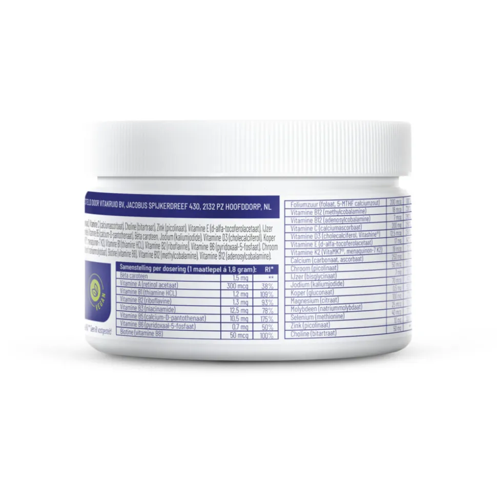 Vitakruid Multi Basis Poeder is een vegan basis Multivitamine welke alle nutriënten bevat in de natuurlijke vorm. Vitakruid Multi Basis Vegan Poeder is 100% plantaardig. Het is een zorgvuldig uitgekozen en ontwikkelde aanvulling op een veganistische of plantaardige levensstijl. Deze nieuwe Multivitamine in poedervorm is ideaal voor als je behoefte hebt aan lichtere doseringen met de juiste verhoudingen. Het bevat o.a. twee soorten Vitamine B12, IJzer, Jodium en Calcium en een actief B-complex.