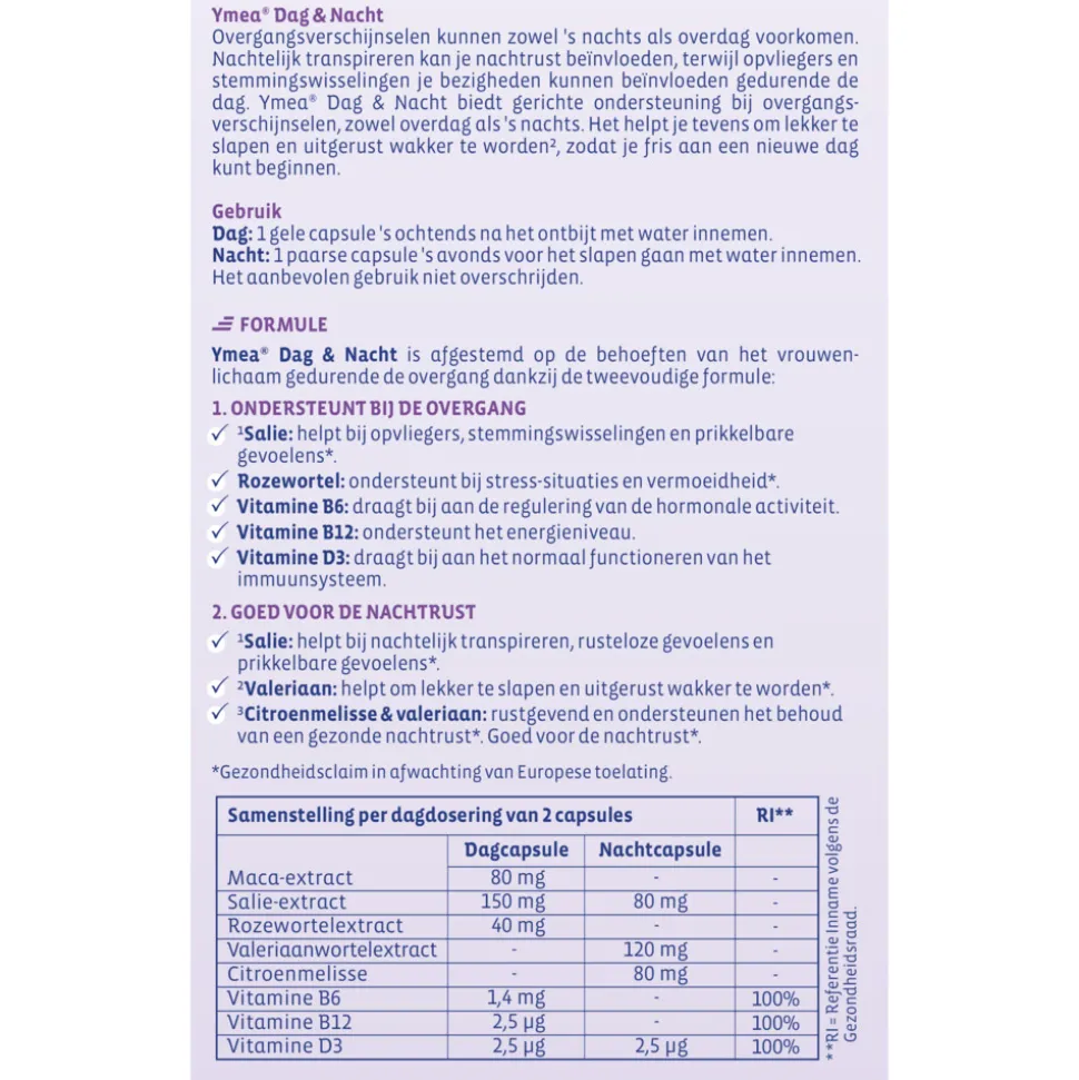 Ymea Dag & Nacht ondersteunt vrouwen op twee manieren tijdens de overgang. De dagcapsule helpt bij opvliegers, wisselende stemmingen en vermoeidheid. De nachtcapsule met Valeriaan en Citroenmelisse helpt om lekker te slapen en om ’s ochtends uitgerust wakker te worden.