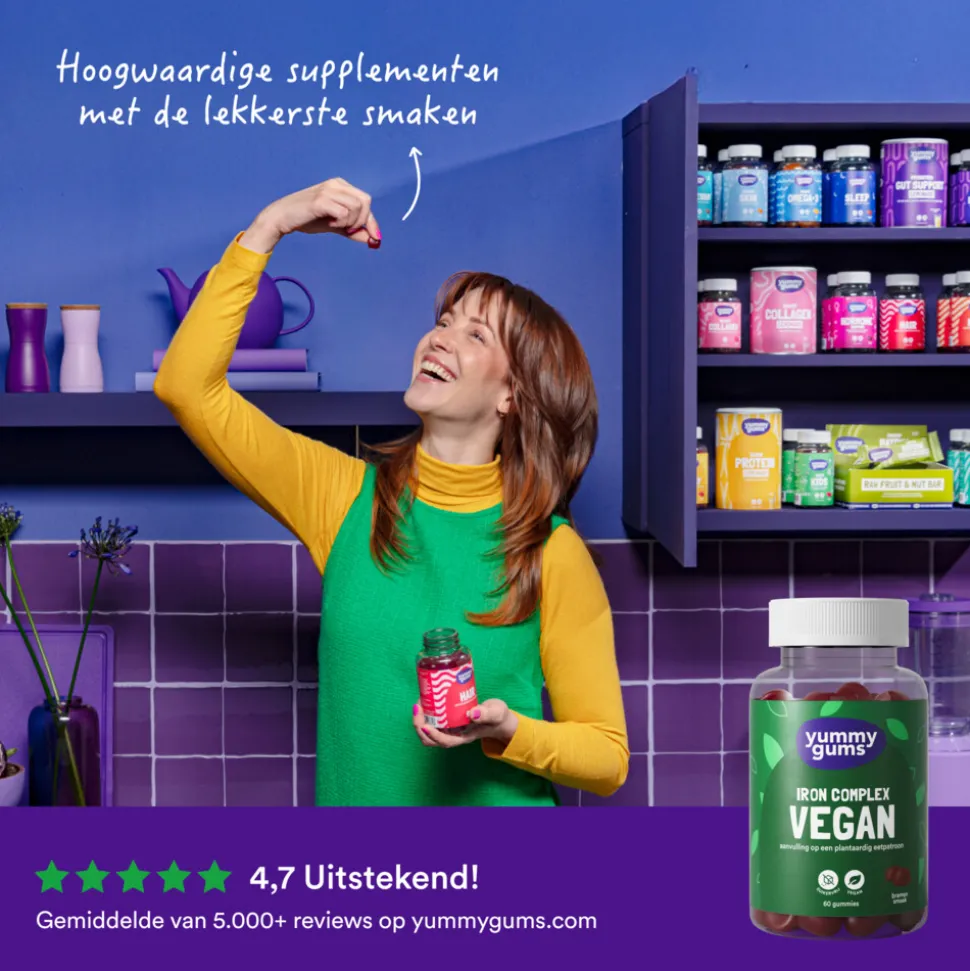 Yummygums Iron Vegan is een gezonde aanvulling op een vega(n) dieet. Als je weinig of geen vleesproducten eet bestaat de kans op een tekort aan vitamine B12. Yummygums Iron Vegan vult dit aan. Yummygums Iron Vegan is geschikt voor volwassenen en kinderen vanaf 12 jaar en heeft een lekkere bramensmaak.