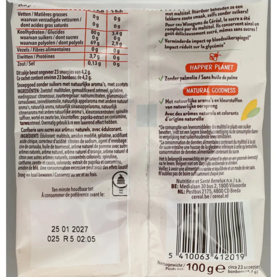 Céréal Winegums is snoepgoed zonder suikers met natuurlijke aroma’s, met zoetstof.