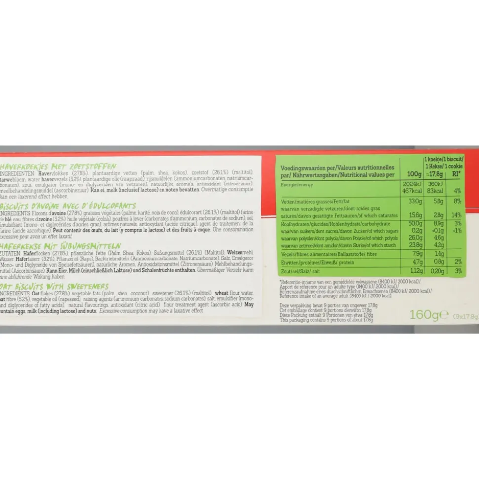 Margarine [(plantaardige vetten (palm*, shea, palmpit, koolzaad, kokos), water, zout, emulgator (mono- en diglycerides van vetzuren), aroma, antioxidant (citroenzuur)], HAVERvlokken, zoetstof (maltitol) , TARWEbloem, HAVERvezel, rijsmiddelen (ammoniumcarbonaten, natriumcarbonaten), zout, natuurlijke aroma’s. Overdreven consumptie kan een laxatief effect hebben. Bevat van nature aanwezige suikers.
