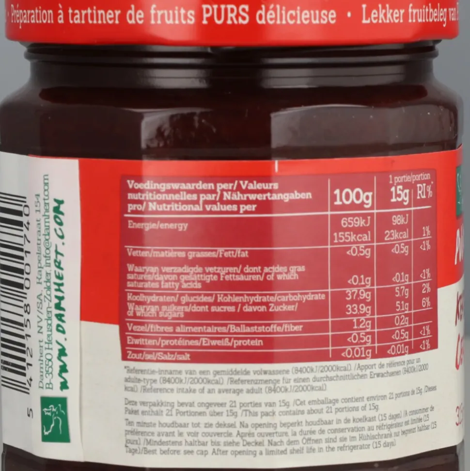 kersen(50%), suiker uit fruit, geleermiddel (pectinen), zuurteregelaars (citroenzuur, calciumlactaat).