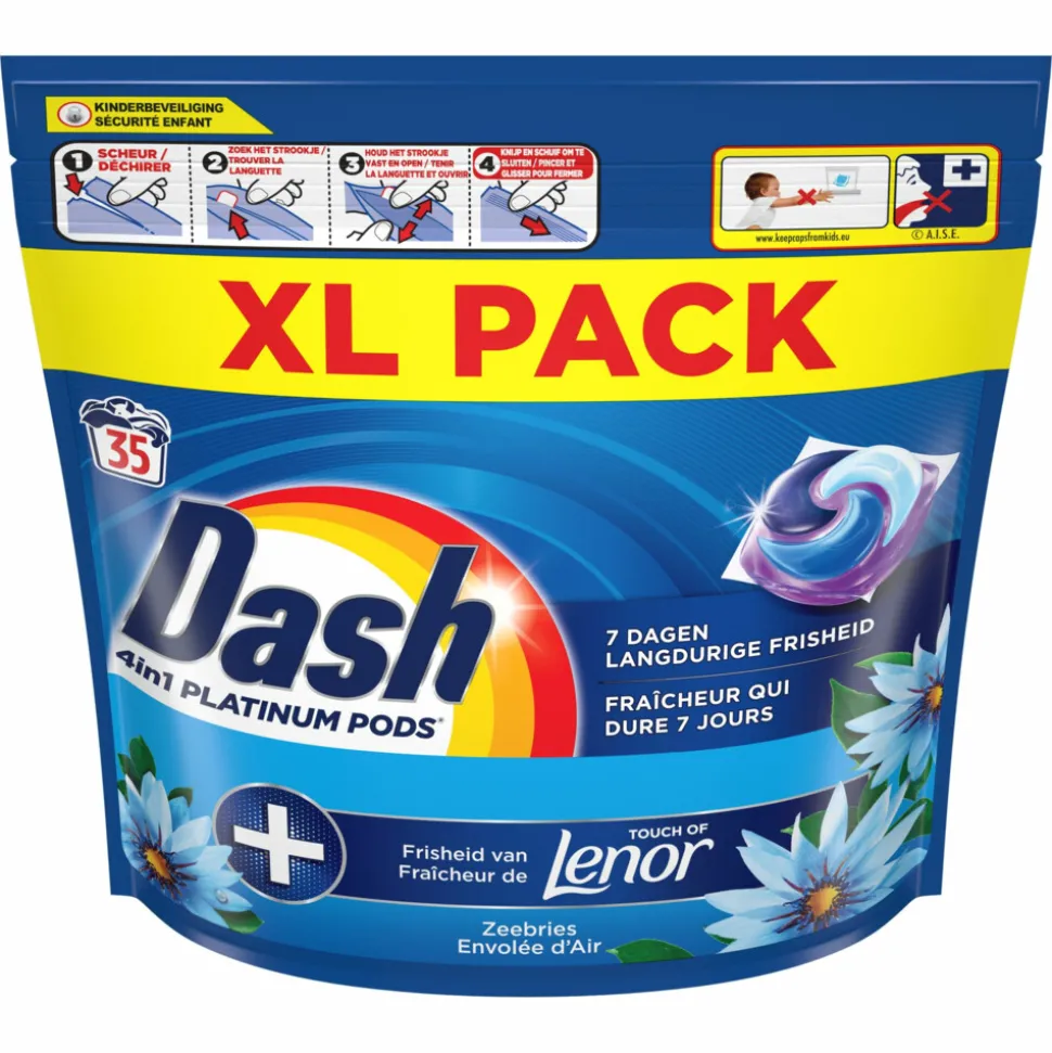 Ontdek Dash Platinum 4in1 Pods wasmiddel +Touch of Lenor Zeebries die een onberispelijke reiniging en 7 dagen langdurige frisheid biedt. Dash Pods wasmiddelcapsules zorgen voor een grondig schone en frisse was, zelfs bij koude wascycli. Ze zijn speciaal ontworpen om snel op te lossen, zelfs in koud water, en leveren onberispelijke was, zelfs bij koude wascycli. Dash Platinum Pods wasmiddelcapsules hebben een film die oplossen in water gedurende de wasbeurt, zodat er vlekverwijderende technologieën kunnen vrijkomen die Dash sterke reinigingsprestaties leveren en 7 dagen langdurige frisheid biedt.