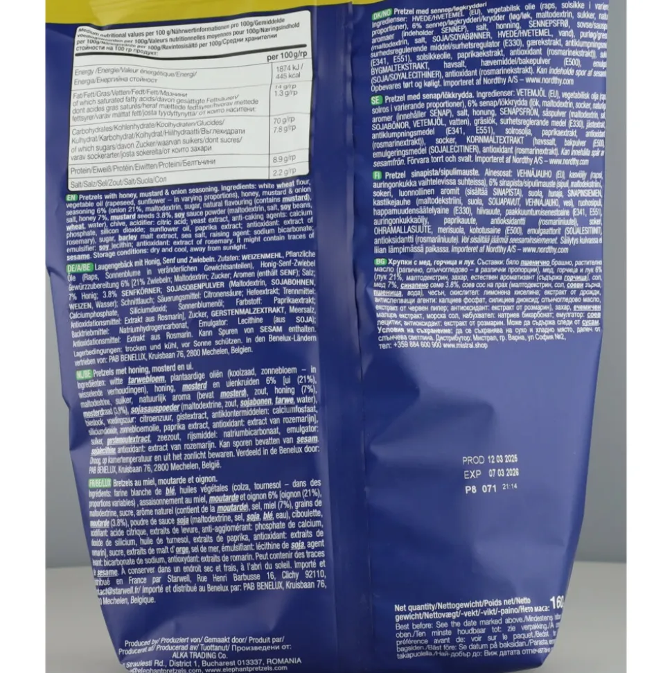 Witte TARWEBLOEM, plantaardige oliën (koolzaad, zonnebloem – in wisselende verhoudingen), honing, MOSTERD en uienkruiden 6% [ui (21%), maltodextrine, suiker, natuurlijk aroma (bevat MOSTERD), zout, honing (7%), MOSTERDzaad (3,8%), SOJASAUSPOEDER (maltodextrine, zout, SOJABONEN, TARWE, water), bieslook, voedingszuur: citroenzuur, gistextract, antiklontermiddelen: calciumfosfaat, siliciumdioxide, zonnebloemolie, paprika extract, antioxidant: extract van rozemarijn], suiker, GERSTEMOUTEXTRACT, zeezout, rijsmiddel: natriumbicarbonaat, emulgator: SOJALECITHINE, antioxidant: extract van rozemarijn