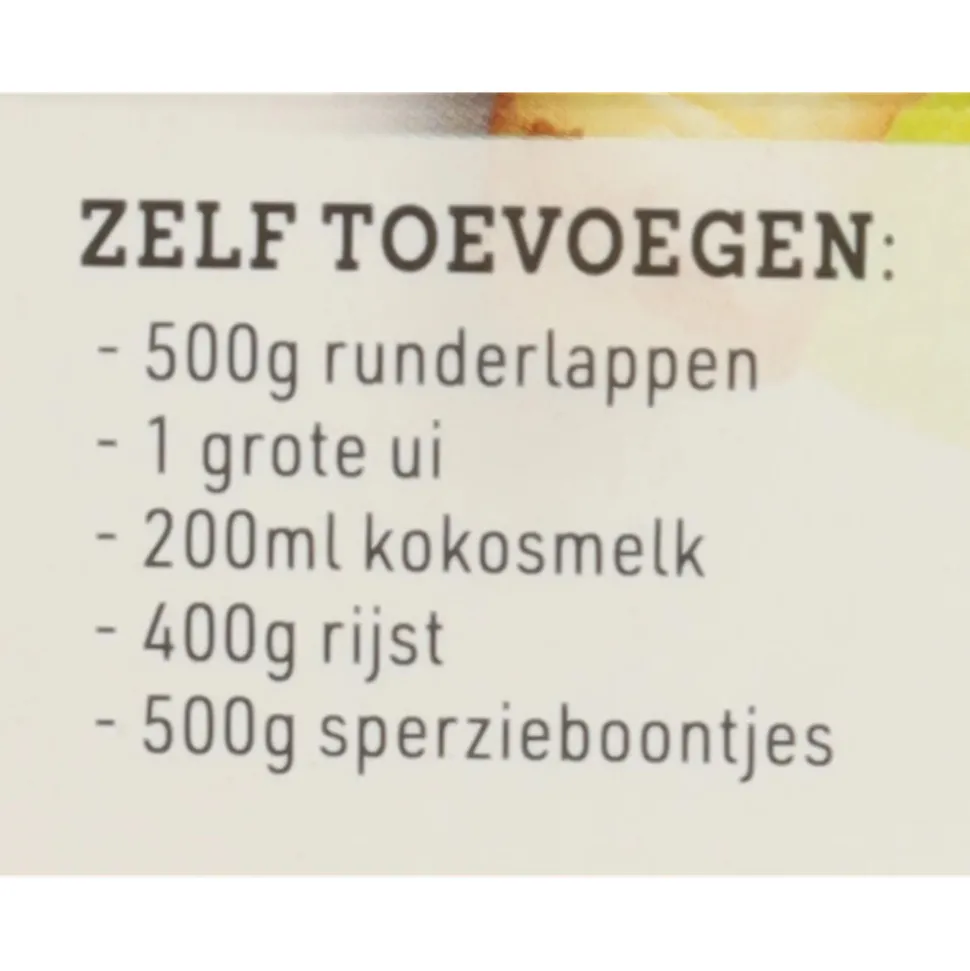 Water, specerijen (citroengras, laos (3,3%), tamarinde (3,2%), gember, rode chilipepers (2,3%), kaffir limeblad (1,3%), kurkumablad, kurkuma, korianderzaad (0,6%), steranijs, komijn, kardamon, kaneel), geraspte kokos, kokosolie, azijn, ui (5,0%), zout, rietsuiker, knoflook (2,3%), rijstbloem. Kokos/ui/citroengras/gember/rijst/kurkuma/kardamon/kaneel: Fairtrade gecertificeerd, verhandeld, gecontroleerd en afkomstig van Fairtrade producenten. Totaal 63%. www.info.fairtrade.net/sourcing