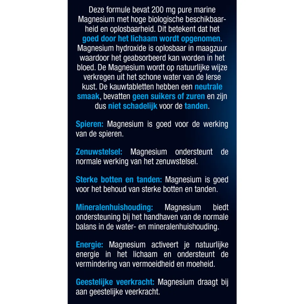Deze formule bevat 200 mg pure marine Magnesium met hoge biologische beschikbaarheid en oplosbaarheid. Dit betekent dat het goed door het lichaam wordt opgenomen. Magnesium hydroxide is oplosbaar in maagzuur waardoor het geabsorbeerd kan worden in het bloed. De Magnesium wordt op natuurlijke wijze verkregen uit het schone water van de Ierse kust. De kauwtabletten hebben een neutrale smaak, bevatten geen suikers of zuren en zijn dus niet schadelijk voor de tanden.