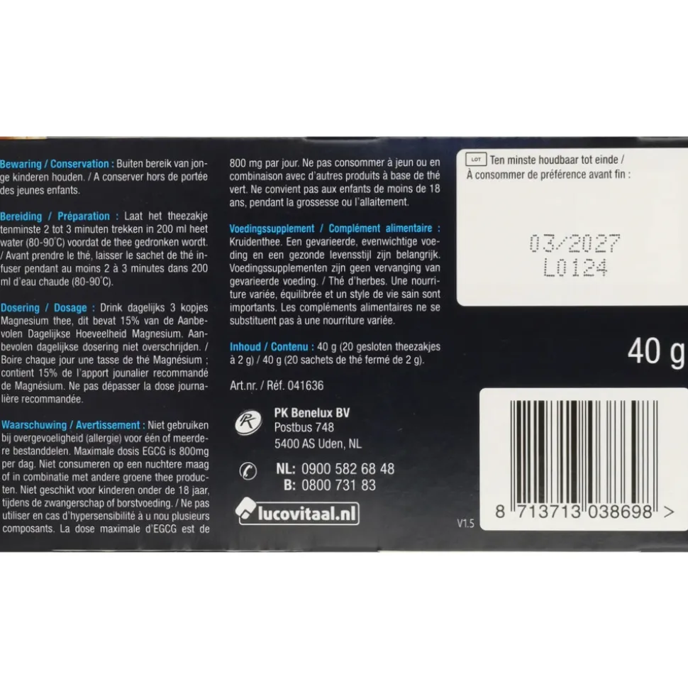 Lucovitaal Thee Magnesium bestaat uit een blend van citroenmelisse, gember, salie en magnesium (60 mg per 3 kopjes). Magnesium is belangrijk voor een normale werking van de spieren en draagt bij tot de instandhouding van sterke botten. De toevoeging van gember zorgt voor een verwarmend effect en geeft de thee een zachte smaak.Drink dagelijks drie kopjes Magnesium thee van Lucovitaal om 60 mg pure magnesium binnen te krijgen.
