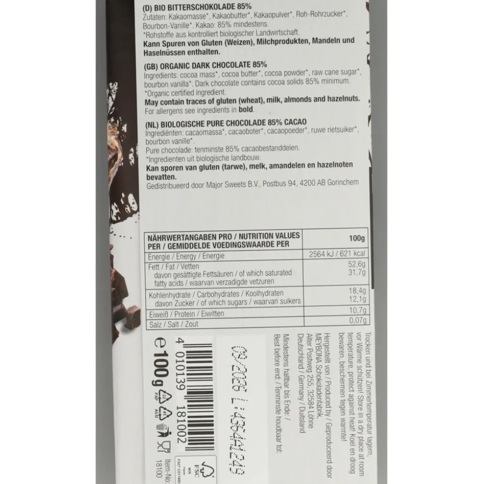 Meybona Organic 85% Dark Chocolate is een pure biologische chocoladereep en simpelweg geschikt voor iedereen die van pure chocolade houdt. De hoogwaardige ingrediënten zijn afkomstig van de beste, gecontroleerde biologische teelt en met bijna 100 jaar ervaring produceert Meybona alleen de beste chocolade met hoge kwaliteit.
