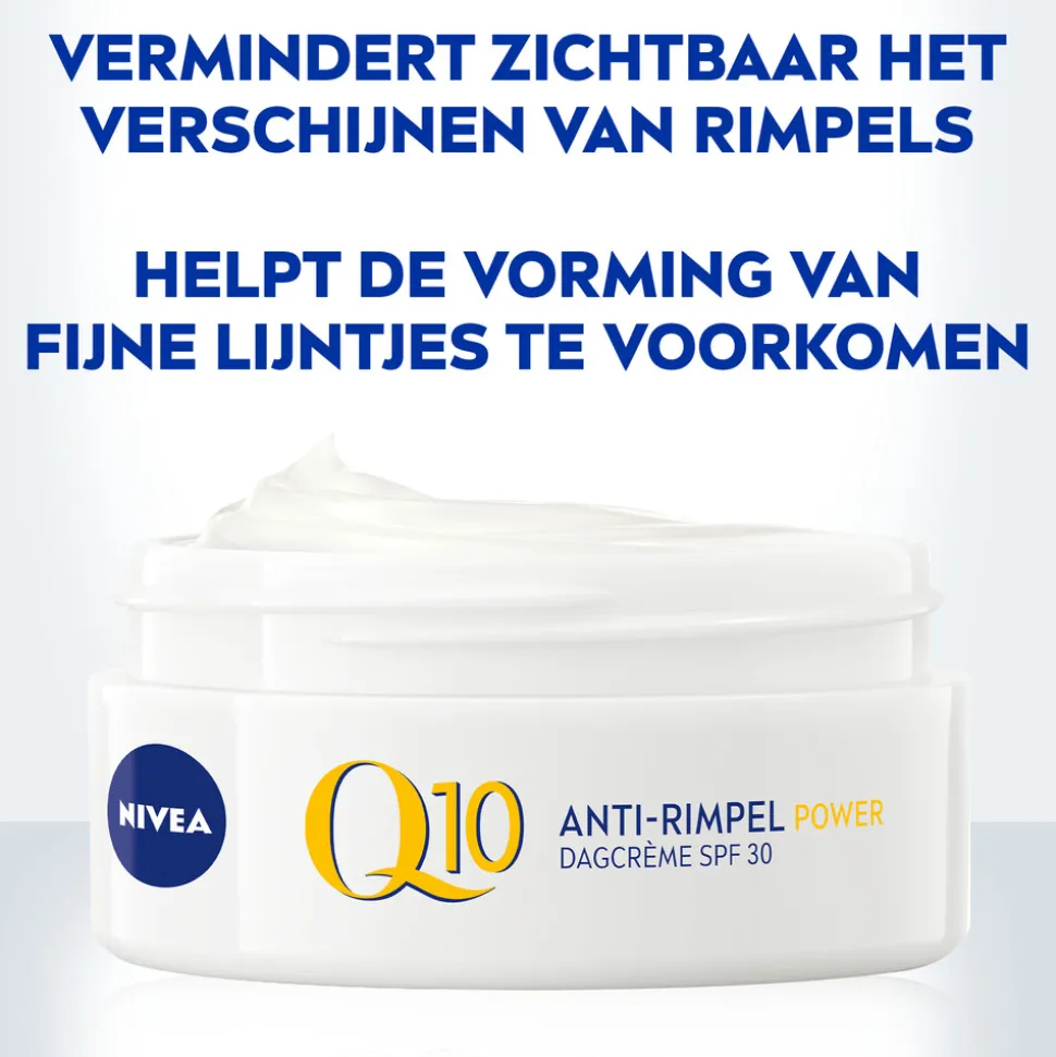 Nivea q10 power anti-rimpel dagcrème spf30 50ml bevat q10 die 100% identiek is aan het huideigen q10. De dagcrème met co-enzym q10 met dubbele werking zorgt voor een 24u anti-rimpel werking, beschermt de huid tegen vrije radicalen en externe invloeden** en geeft de huid energie terwijl het het natuurlijke huidverouderingsproces afremt. De innovatieve formule met spf30 zorgt voor zichtbaar verminderde rimpels en beschermt tegen uva/uvb-stralen die vroegtijdige huidveroudering kunnen veroorzaken. De huid voelt gladder, meer gevoed en gezonder aan. Zichtbaar stevigere huid, verminderde rimpels vanaf 1 week*, voortdurende verbeteringen** en voorkomt nieuwe rimpels. Nivea q10 power anti-rimpel dagcrème spf15 is geschikt voor alle huidtypen. Huidvriendelijkheid dermatologisch goedgekeurd.*1 week studie met 47 vrouwen, 2020.**4 weken studie met 38 vrouwen, 2020. #excl. Label, sluitschijf en folie.***in vitro getest.