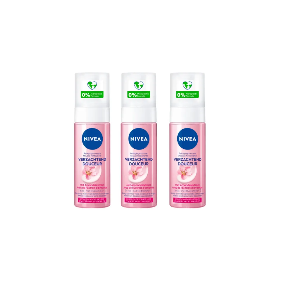 De NIVEA verzachtende Reinigings-Mousse is verrijkt met amandelextract en hydramine, waarvan bekend is dat het effectief vocht in de huid bindt. Speciaal ontwikkeld voor de droge en gevoelige huid, reinigt het niet alleen zacht zonder uit te drogen, maar verzorgt het de huid ook mild en zorgt het voor een geweldige reinigingservaring dankzij de zachte schuimformule.