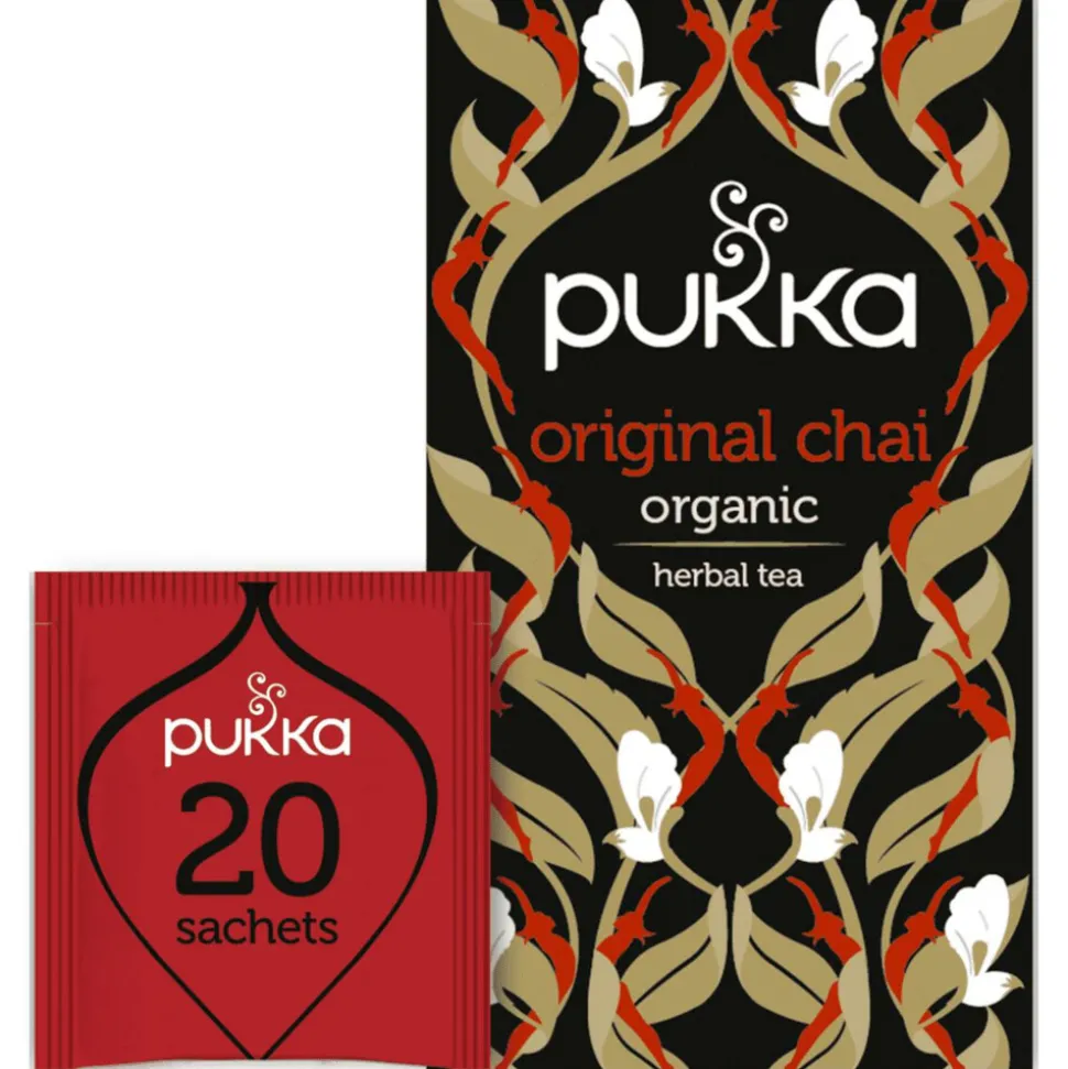Pukka streeft ernaar positieve verandering te brengen op de wereld – voor jou, de natuur en alles daar tussenin. Pukka Original Chai is een blend met kaneel, zwarte thee, gember, kardemom en zoethout. Gemaakt van 100% biologische ingrediënten die duurzaam verbouwd zijn. Breng deze heerlijke kruiden tot leven door ze tot 15 minuten in vers gekookt water te laten trekken.