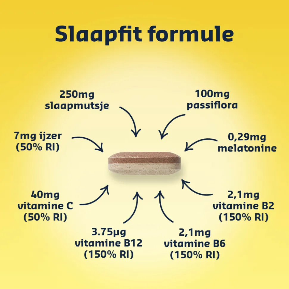 1 tablet bevat 0,29 Melatonine, 250 mg Slaapmutsje, Vitamine B2 (2,1 mg), B6 (2,1 mg) en B12 (3,75 mcg), 40 mg Vitamine C, 7 mg IJzer & 100 mg Passiflora.