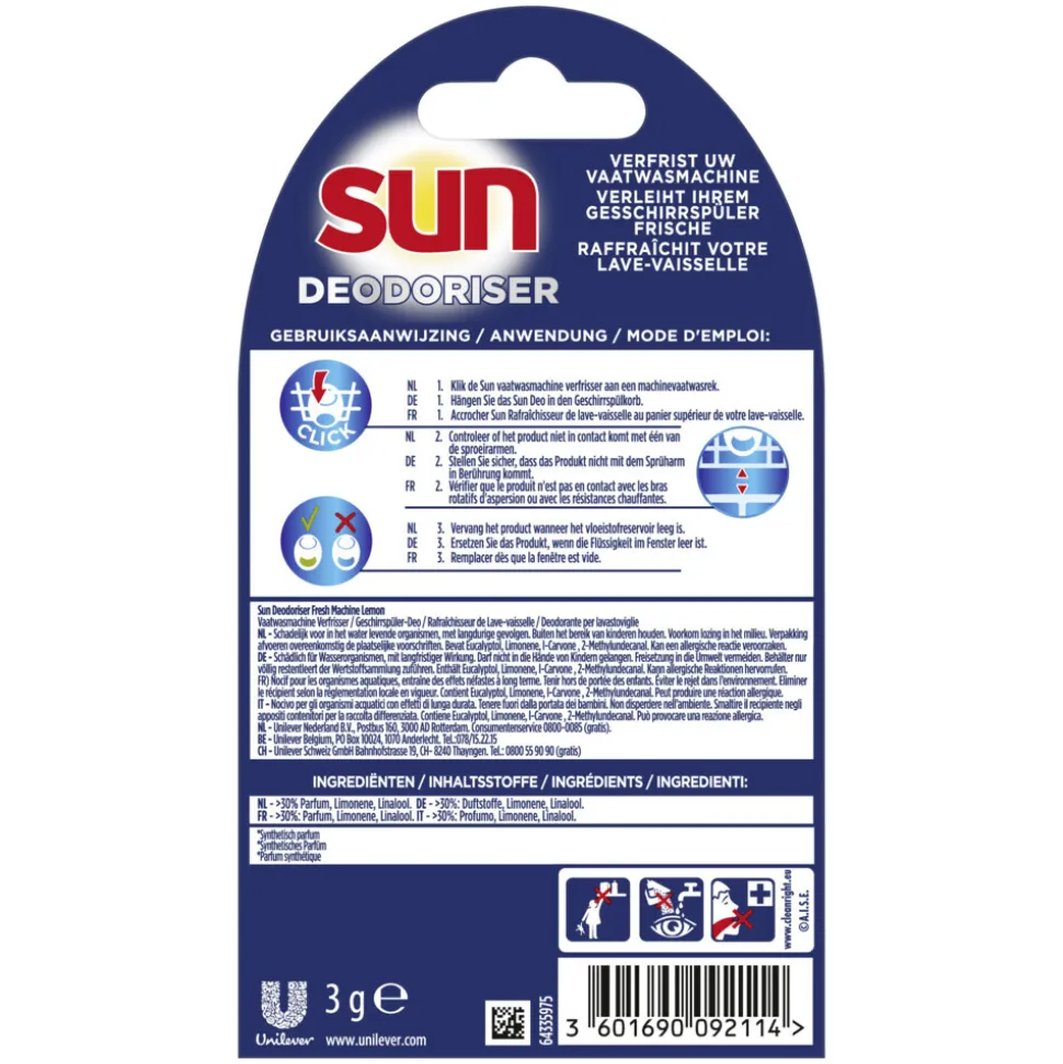 Sun Citroen Vaatwasmachine Verfrisser neutraliseert effectief de nare geurtjes in je vaatwasser. Nare geurtjes in je vaatwasmachine zijn verleden tijd met de Sun Citroen Vaatwasmachine Verfrisser. Deze Sun machineverfrisser ontgeurt en verfrist en verspreidt een aangename citroengeur zodat je vaatwasser lekker ruikt, ook tussen wasbeurten door. Je hebt dus geen last meer van nare geurtjes wanneer je je vaatwasser opent, niet als die schoon is, maar ook niet wanneer er vuile vaat in de vaatwasser staat. Sun Citroen Vaatwasmachine Verfrisser gaat ten minste 60 wasbeurten mee. Dit product laat geen chemische resten of geurstoffen achter op je vaat. Je kunt de machineverfrisser dus zorgeloos in je vaatwasser laten zitten totdat het vloeistofreservoir leeg is. Zo kun je langdurig genieten van heerlijk ruikende vaat. Ook tussen vaatwasbeurten door blijft de machineverfrisser werken, zo komt de heerlijke geur je tegemoet wanneer je de vaatwasser opent om er bijvoorbeeld nieuwe vaat in te zetten. Dat is heel wat beter dan de geur van vuile vaat.
