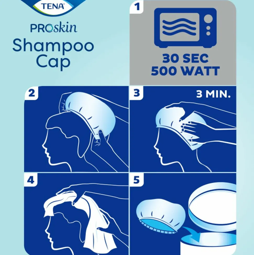 TENA ProSkin Shampoo Cap is een douchecap die geïmpregneerd is met fris geparfumeerde shampoo en conditioner voor comfortabel en gemakkelijk haar wassen wanneer douchen of in bad gaan een uitdaging vormen. De douchecap is eenvoudig te gebruiken. Plaats hem over droog haar en masseer de shampoo en conditioner voor drie minuten in het haar. Geeft het haar een fris en schoon gevoel – naspoelen is niet nodig. De cap kan ook worden opgewarmd in de magnetron in zijn ongeopende verpakking voor extra comfort. Niet bedoeld om het haar droog te houden.