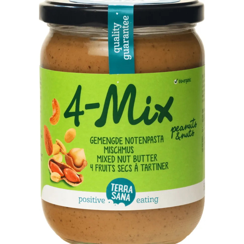 Terrasana Notenpasta 4-mix is een heerlijke gemengde notenpasta, gemaakt van biologische cashewnoten, hazelnoten, amandelen en pinda’s. Je proeft iedere noot afzonderlijk terug, maar ervaart toch een heel andere smaaksensatie dan bij niet-gemengde notenpasta.