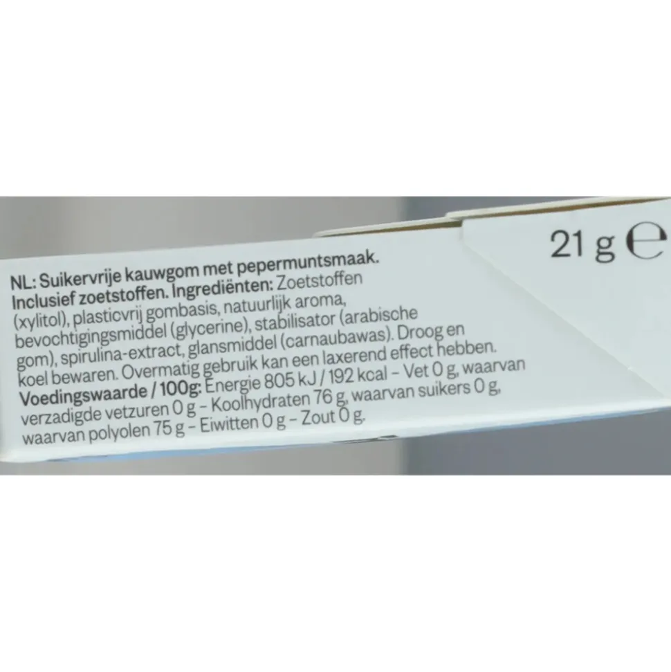 Zoetstoffen (xylitol/steviolglycosiden), chicle gom-basis, natuurlijke aroma’s, vochtinbrengende stof (koolzaadglycerine), stabilisatiemiddel (acaciagom), spirulina-extract, glansmiddel (carnaubawas).
