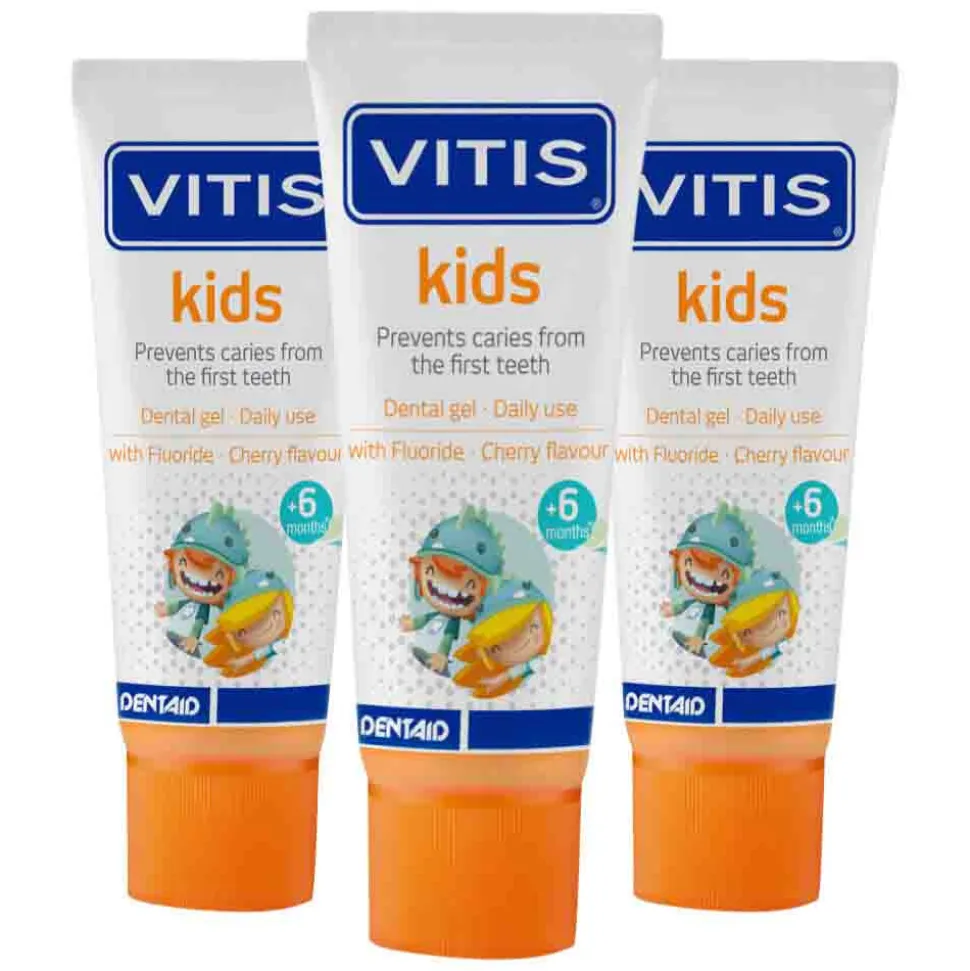 Vitis Kids Tandgel is een tandpasta die speciaal ontwikkeld is om melktanden in de fase van het wisselgebit gezond te houden. De tandgel is geschikt voor kinderen vanaf 6 maanden. Dankzij de actieve stoffen natriumfluoride en xylitol, helpt Vitis Kids Tandgel preventief tegen gaatjes en herstelt de gel het tandglazuur. Vitis Kids Tandgel heeft een aangename frisse kersensmaak waardoor kinderen al op vroege leeftijd een goede en plezierige poetsgewoonte aan kunnen leren.