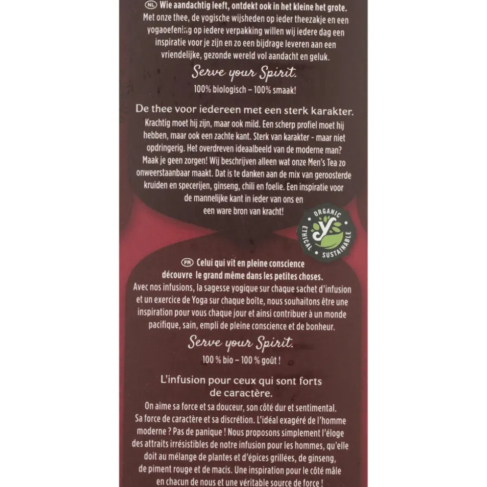 Stress, uitputting en overmatig eten kunnen een negatieve invloed hebben op de kracht van een man. Het evenwicht kan worden hersteld door sport, goede rust en gezonde voeding. Dan kun je als man je ideeën en mogelijkheden weer realiseren. Yogi Tea Men’s Tea met gember, geroosterde chicorei en chilipeper smaakt geweldig op elk moment van de dag.
