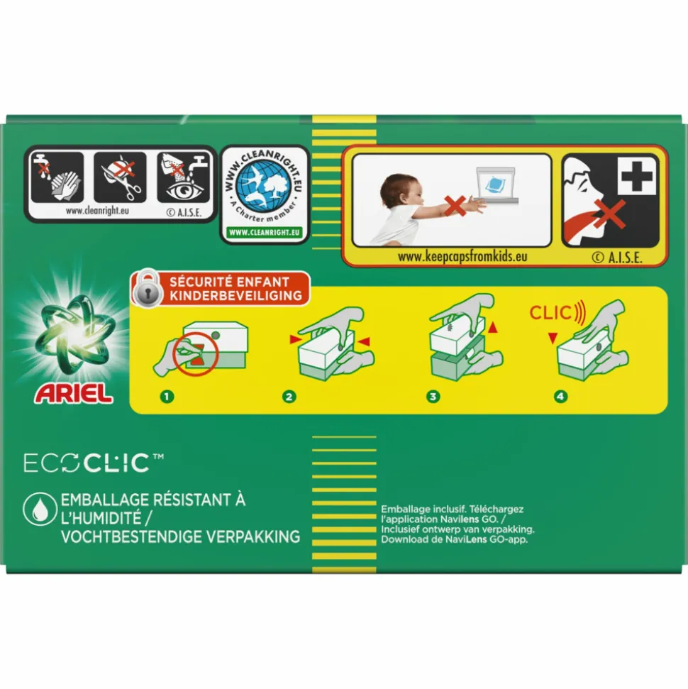 - ECOCLIC kartonnen doos: Zorg voor minder plastic met Ariel 3in1 Pods wasmiddelcapsules, verpakt in een recyclebare kartonnen doos die gemaakt is met 70% gerecyclede vezels en maximaal 5% plastic, ontworpen om je Pods te bewaren
