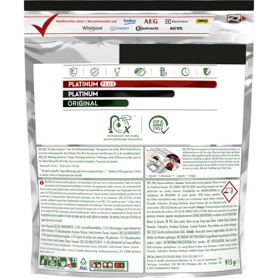 De Dreft All-in-One Dreft Platinum Plus vaatwastabletten zorgen voor vaat als nieuw, met een uitzonderlijke reiniging die hardnekkige vlekken verwijdert, zelfs met extreem vuile vaat tijdens een kort prorgamma. De Dreft capsules worden aanbevolen door fabrikanten van vaatwassers over de hele wereld. Ze verwijderen hardnekkige voedselresten en laten jouw vaat als nieuw achter. Dreft Platinum Plus biedt onze beste reinigingsactie en verwijdert de doffe uitstraling die in de loop van de tijd ontstaat, zodat uw vaat weer in zijn oorspronkelijke glans terugkomt, dankzij de anti-dofheidstechnologie.