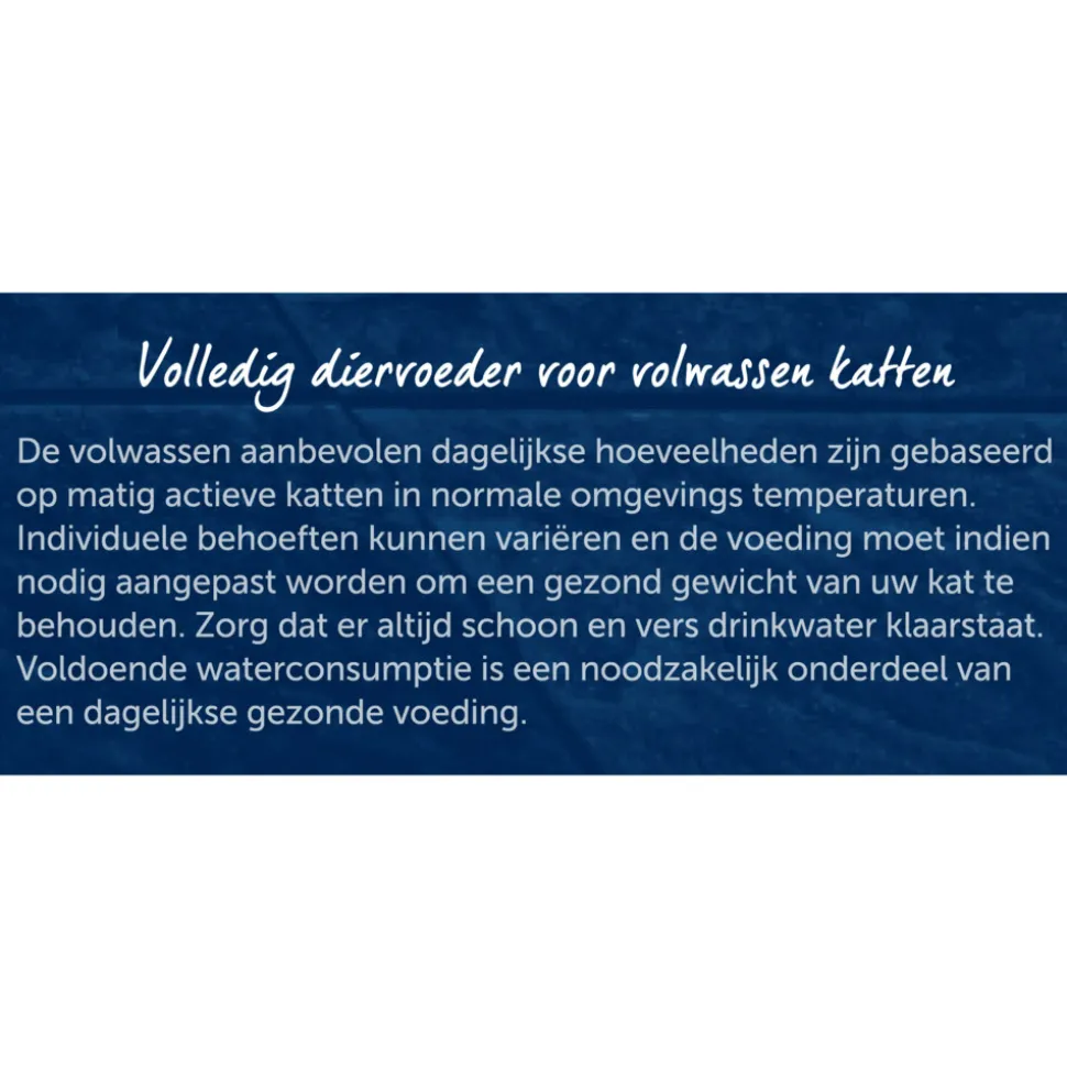 De aangegeven hoeveelheden zijn gemiddelden gebaseerd op de behoefte van normale actieve, volwassen katten in een normale omgevingstemperatuur. Individuele behoeften varieren en de voeding moet indien nodig aangepast worden om het gezone gewicht van je kat te behouden.