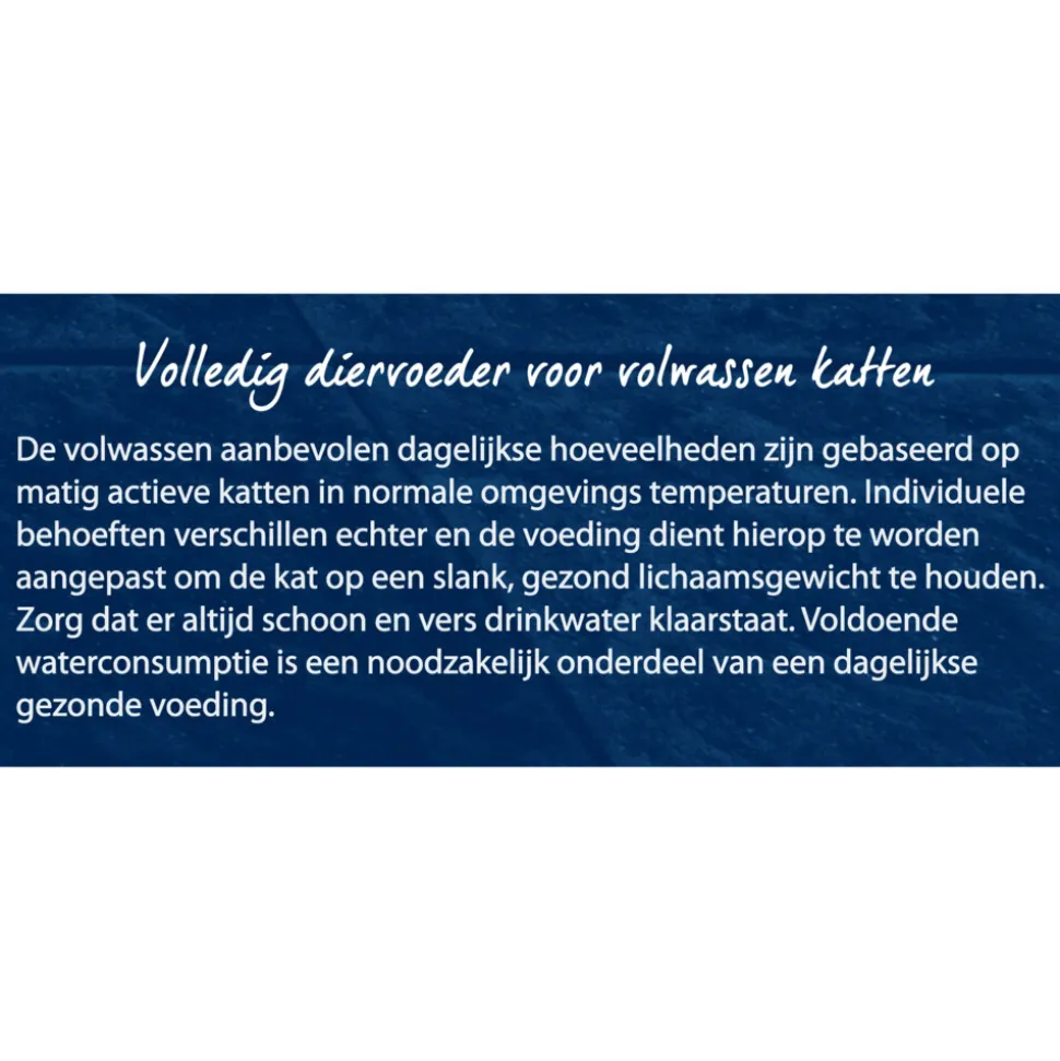 De aangegeven hoeveelheden zijn gemiddelden gebaseerd op de behoefte van normale actieve, volwassen katten in een normale omgevingstemperatuur. Individuele behoeften varieren en de voeding moet indien nodig aangepast worden om het gezone gewicht van je kat te behouden.