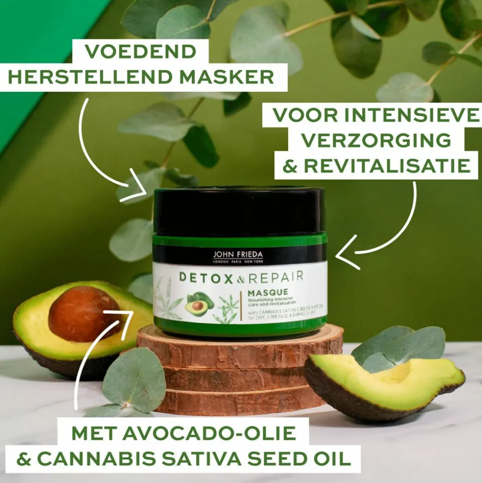 John Frieda Detox & Repair Masker is speciaal ontwikkeld voor droog, gestresst of beschadigd haar. Dit masker, verrijkt met cannabis sativa zaad olie & avocado, biedt intensieve hydratatie en diepe verzorging voor gezond ogend haar. Voor zichtbaar hersteld en zacht haar.