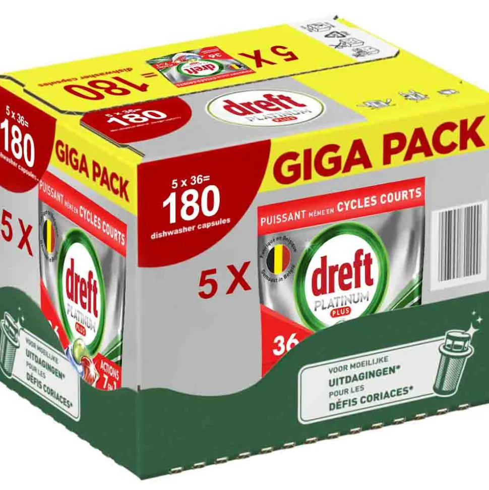 Dreft Platinum Plus All in One vaatwastabletten zorgen voor een reiniging als nieuw, het geeft je Dreft’s beste collectie voor het reinigen van hardnekkig voedsel en het helpt zelfs de dofheid weg te nemen die in de loop van de tijd is opgebouwd, om de oorspronkelijke glans van je vaatwerk te herstellen. Dreft Platinum Plus geeft je een uitmuntende reiniging en verwijdert hardnekkige voedselvlekken, zelfs in de testconditie van een korte cyclus. Dus, als je weinig tijd hebt, is er niets aan de hand. Schakel over op kort. Dreft combineert vloeistof en poeder in één krachtige capsule. Het ultra-oplosbare zakje lost snel op en werkt goed in korte cycli omdat het snel begint te reinigen om de klus klaar te krijgen. En ze zijn gemakkelijk te gebruiken. Plaats ze gewoon in het doseerbakje van je vaatwasser, met verpakking.