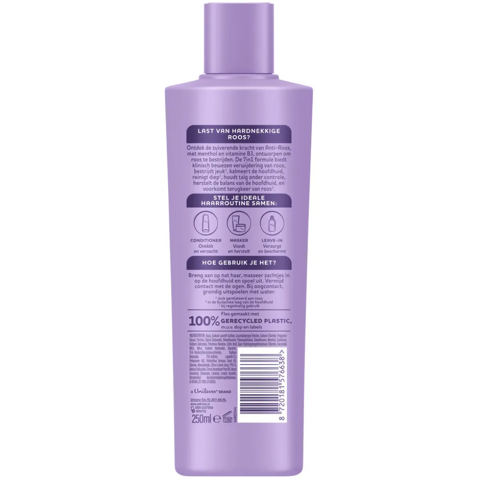 Heb je last van hardnekkige roos? Ontdek de zuiverende kracht van de Andrélon Anti-Roos Shampoo, verrijkt met menthol en vitamine B3, klinisch bewezen om roos te verwijderen. De doeltreffende formule biedt 7 voordelen in 1 krachtige formule: zo zorgt het voor klinisch bewezen verwijdering van roos, bestrijdt jeuk*, kalmeert de hoofdhuid, reinigt diep**, houdt talg onder controle, herstelt de balans van de hoofdhuid en voorkomt de terugkeer van roos***. Ga de strijd aan tegen roos en geniet van een gekalmeerde hoofdhuid en roosvrije look. Zo hoef jij je niet meer druk te maken over eventuele witte deeltjes in je haar en op je hoofdhuid en kan je weer stralend de dag door!