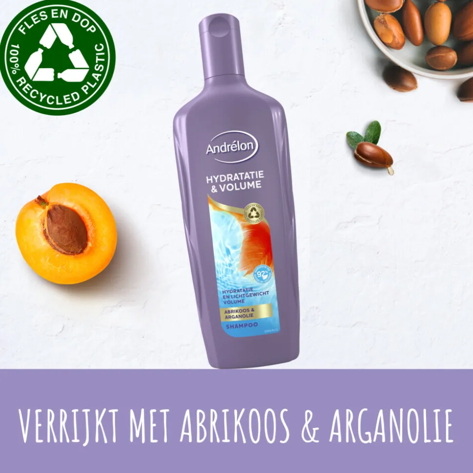 Andrélon Hydratatie & Volume Shampoo geeft intensieve hydratatie en lichtgewicht volume aan droog en futloos haar. De shampoo zorgt voor gehydrateerd en mooi verzorgd haar vol volume. De voedende shampoo, verrijkt met abrikoos en arganolie, heeft een vochtinbrengende werking en zorgt voor intensieve hydratatie en lichtgewicht volume. Deze lichtgewicht shampoo voedt tot diep in de wortel van je haar en versterkt en verzorgt je haar zonder het te verzwaren. Het resultaat is een voelbaar en zichtbaar lichtgewicht volume-effect en haar dat heerlijk ruikt. De shampoo is gemaakt met 92% ingrediënten van natuurlijke oorsprong. Deze fles en dop zijn 100% recyclebaar, gooi de fles dus weg bij het plasticafval.