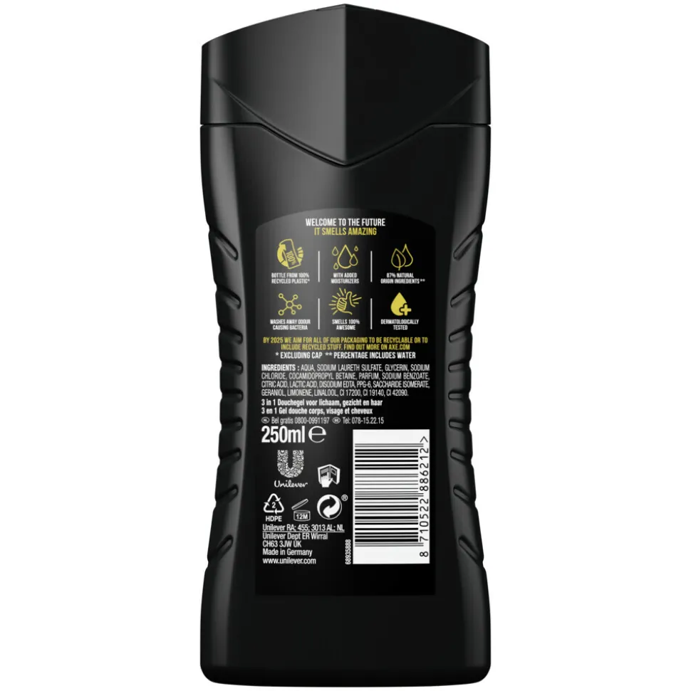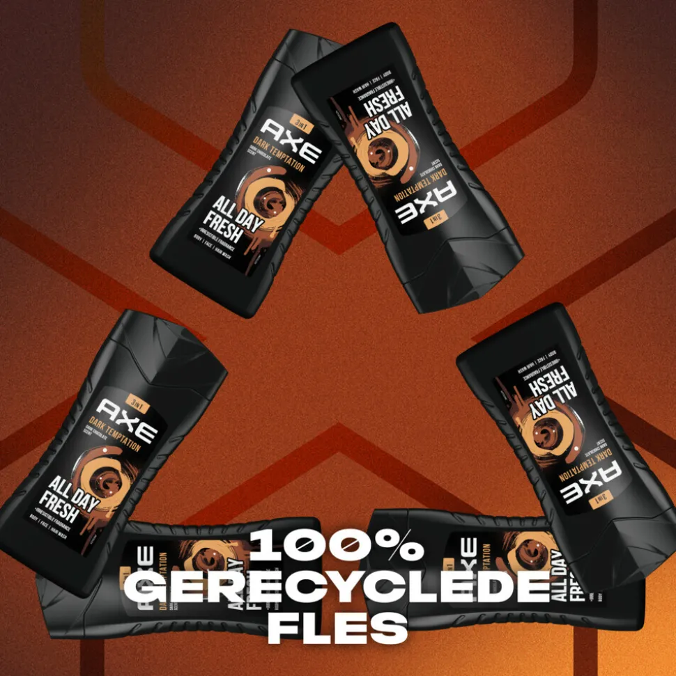 - AXE douchegel is verpakt in een 100% gerecyclede en recyclebare fles