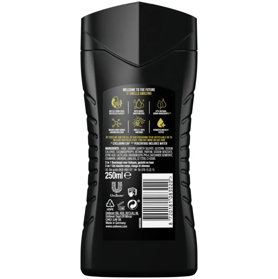 Bij AXE geloven we dat een van de sleutels tot aantrekkingskracht een onweerstaanbare geur is. Daarom zijn wij toegewijd om je de beste tools te geven zodat jij, wanneer de gelegenheid zich voordoet, op je best ruikt. Van onze aftershave tot onze douchegel, van onze anti-transpirant tot onze deodorant, we doen er alles aan om ervoor te zorgen dat aantrekkingskracht voor iedereen is. Het vernieuwde en verbeterde AXE. Zorg goed voor jezelf en voor onze planeet. Deze AXE douchegel is verpakt in een 100% gerecyclede en recyclebare fles. AXE streeft ernaar dat al onze verpakkingen in 2025 recyclebaar zijn of gerecyclede materialen bevatten.