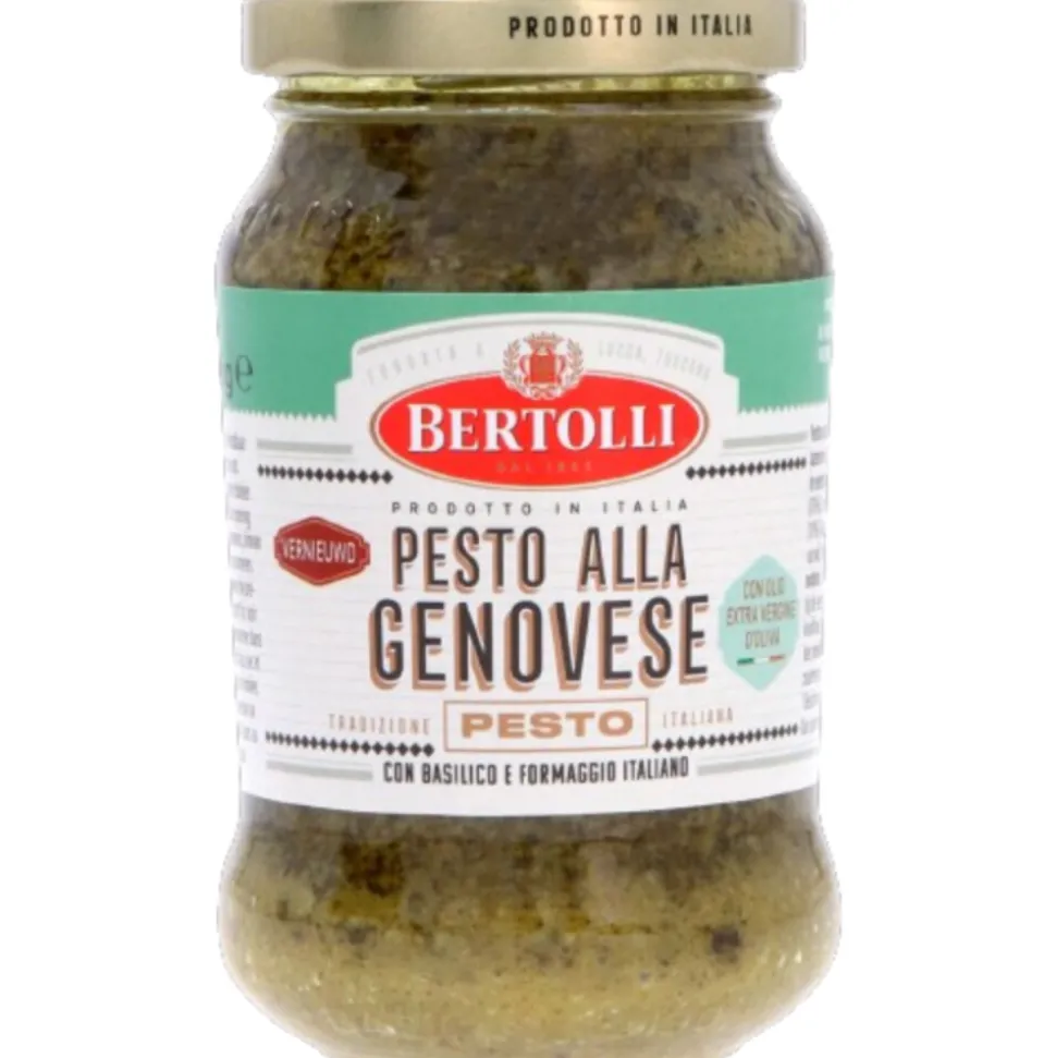 Bertolli Pesto Alla Genovese is vernoemd naar de stad waar het vandaan komt, Genua. In alle Bertolli producten worden alleen de beste ingrediënten en de puurste smaken verwerkt. Dat proef je ook terug in de Bertolli Pesto alla Genovese, een heerlijke pesto die in diverse recepten kan worden verwerkt. Probeer deze pesto eens in een marinade, als salade dressing of op een toastje. Daarnaast is deze groene pesto erg lekker in pastagerechten, zoals in een recept met garnalen, tomaatjes, paprika en rucola.