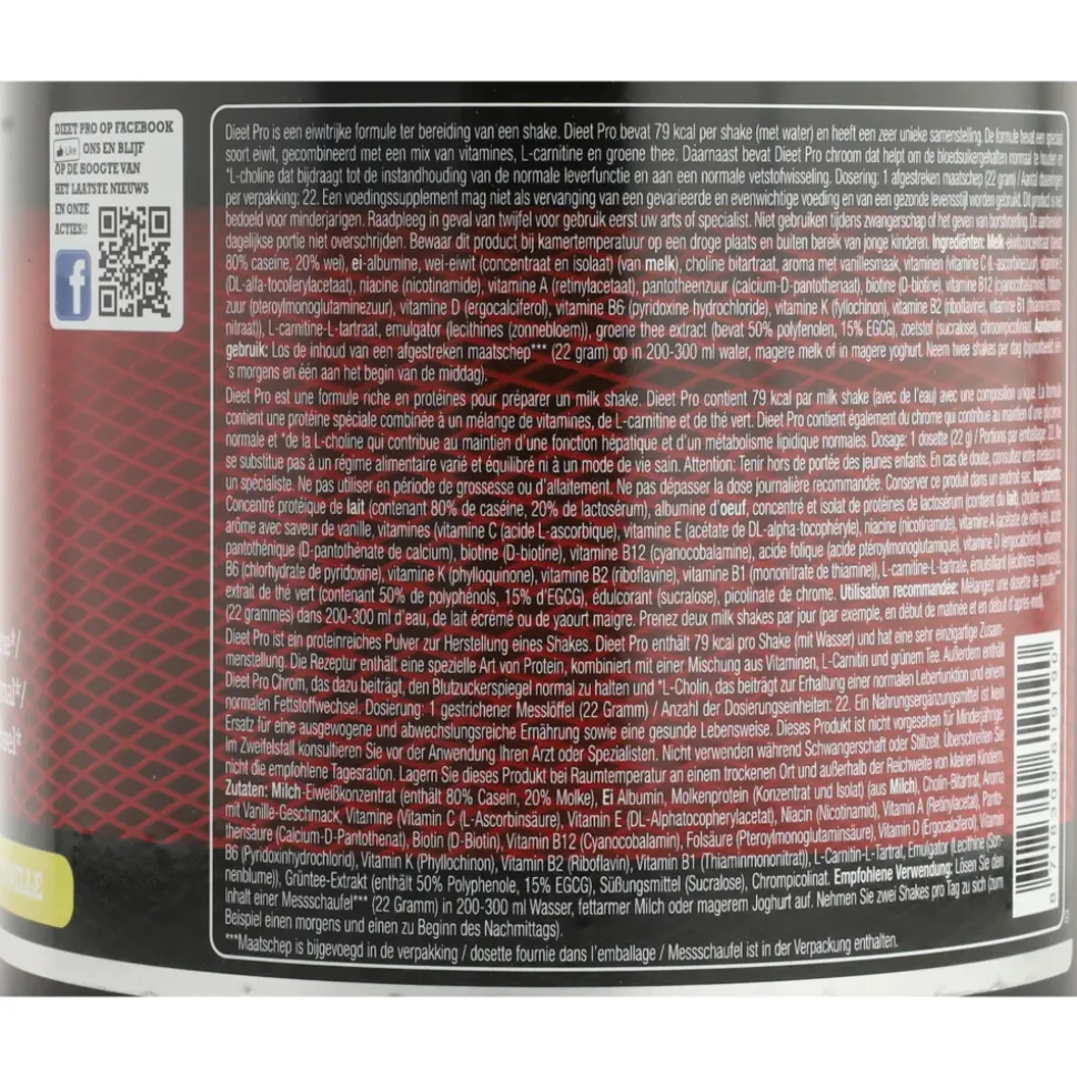Heeft een unieke formule van slechts 79 kcal per shake die nagenoeg koolhydraatvrij, vetvrij en suikervrij is. Dieet Pro bevat per shake maar liefst 18 gram van een speciaal soort eiwit. Daarnaast bevat Dieet Pro een complete mix van vitamines en mineralen, waaronder vitamine