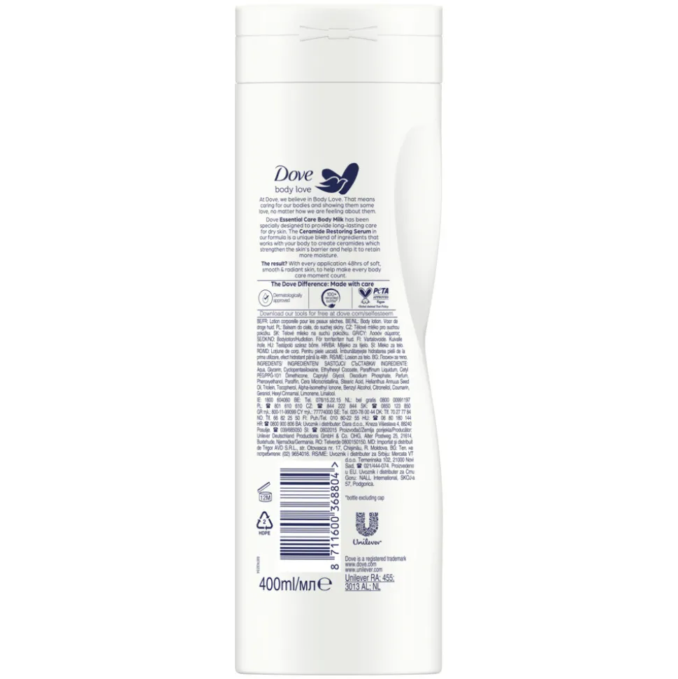 Dove Body Love Essential Care Bodylotion met Ceramide Restoring Serum biedt langdurige verzorging voor een zachte, gladde en stralende huid.