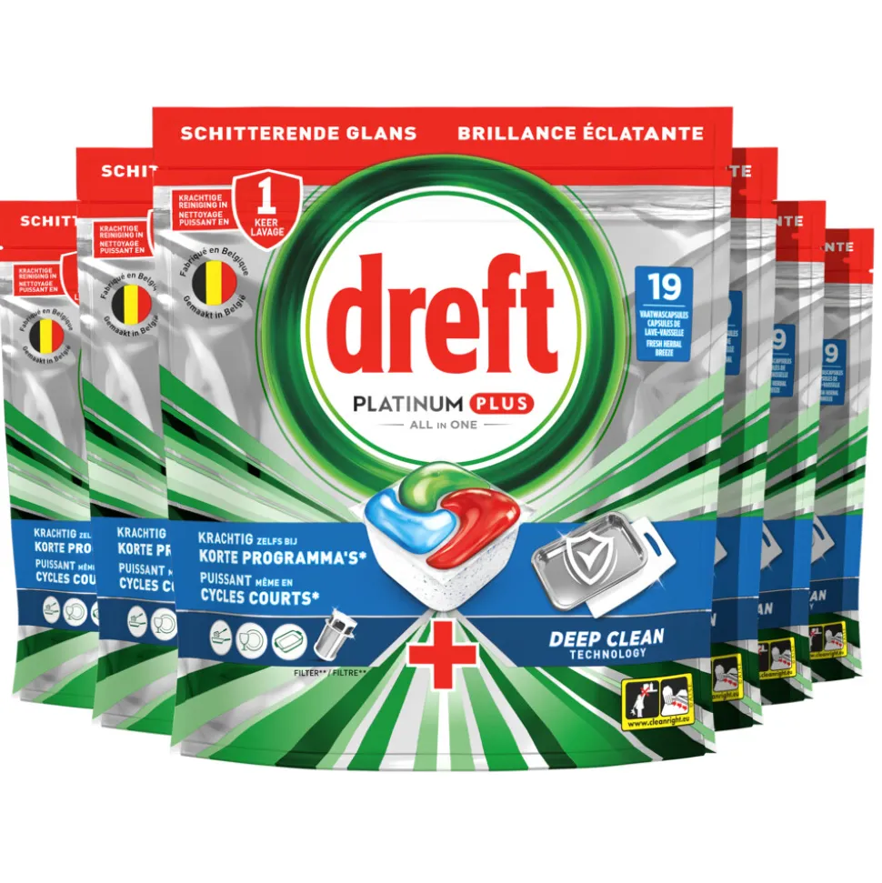 De Dreft All-in-One Dreft Platinum Plus vaatwastabletten zorgen voor vaat als nieuw, met een uitzonderlijke reiniging die hardnekkige vlekken verwijdert, zelfs met extreem vuile vaat tijdens een kort prorgamma. De Dreft capsules worden aanbevolen door fabrikanten van vaatwassers over de hele wereld. Ze verwijderen hardnekkige voedselresten en laten uw vaat als nieuw achter. Dreft Platinum Plus biedt onze beste reinigingsactie en verwijdert tot 99% van de zichtbare en onzichtbare voedselresten, dankzij hun Deep Clean-technologie.