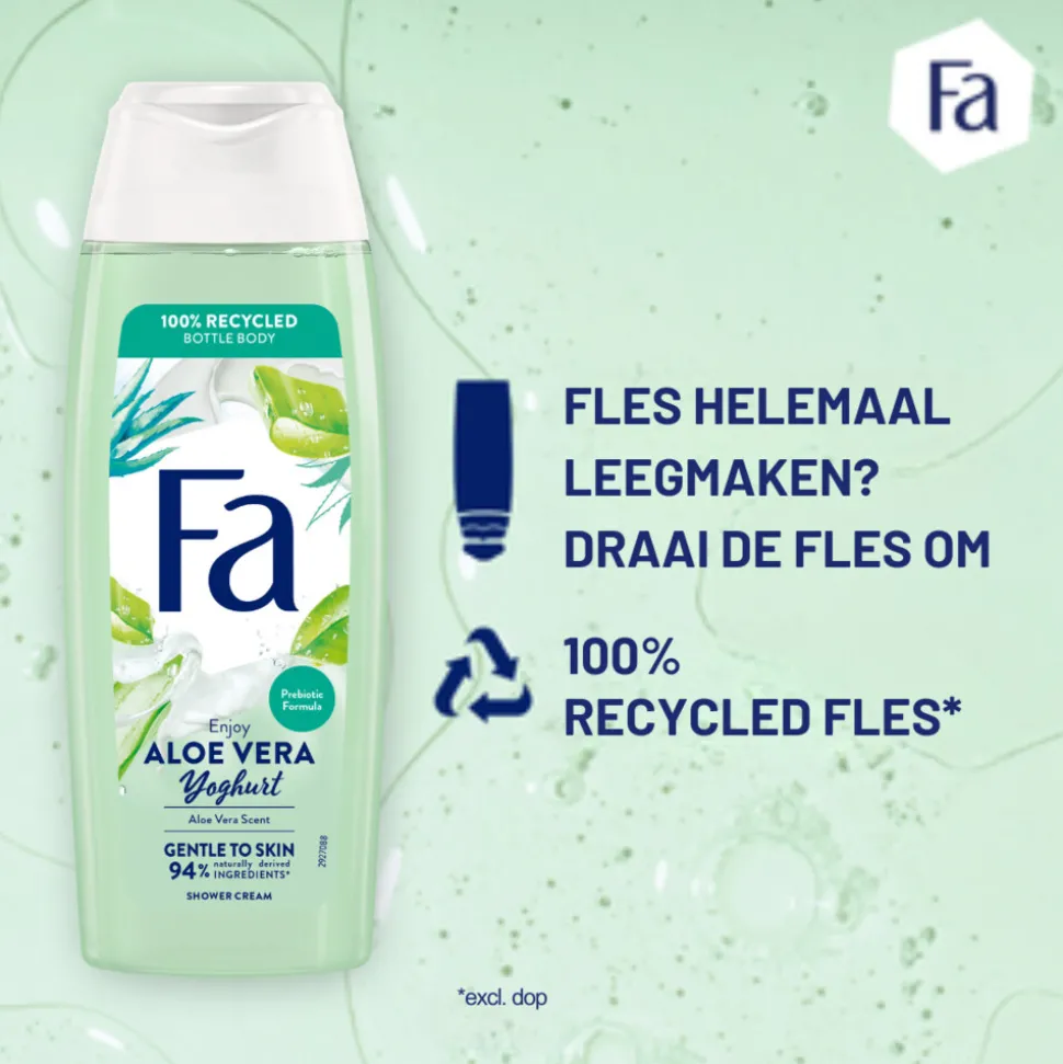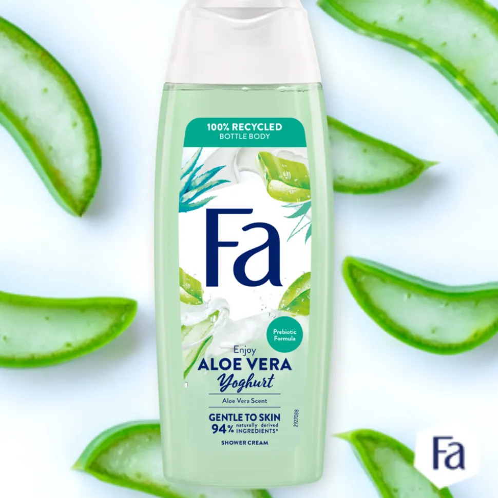 Ontdek Fa Yoghurt Aloe Vera douchegel met de geur van aloe vera. De probiotische formule bevat >94% ingrediënten van natuurlijke oorsprong (incl. water).