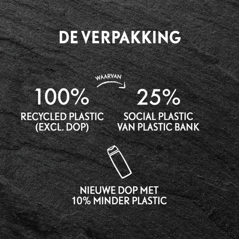 - De verpakking bestaat uit 100% gerecycled plastic (excl. dop), waarvan 25% social plastic.