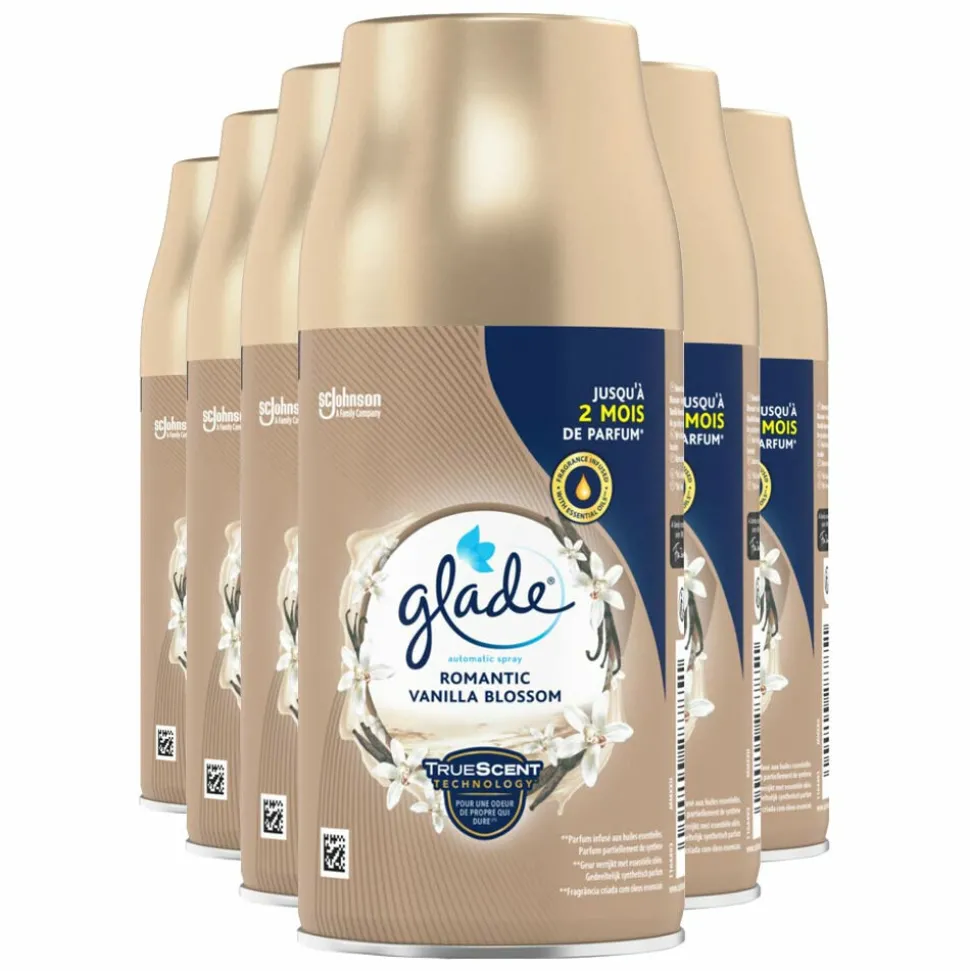 Glade Automatic Spray Romantic Vanilla Blossom navulling geeft week na week een zachte geur af van romige vanillebloesem, witte orchidee en sandelhout.