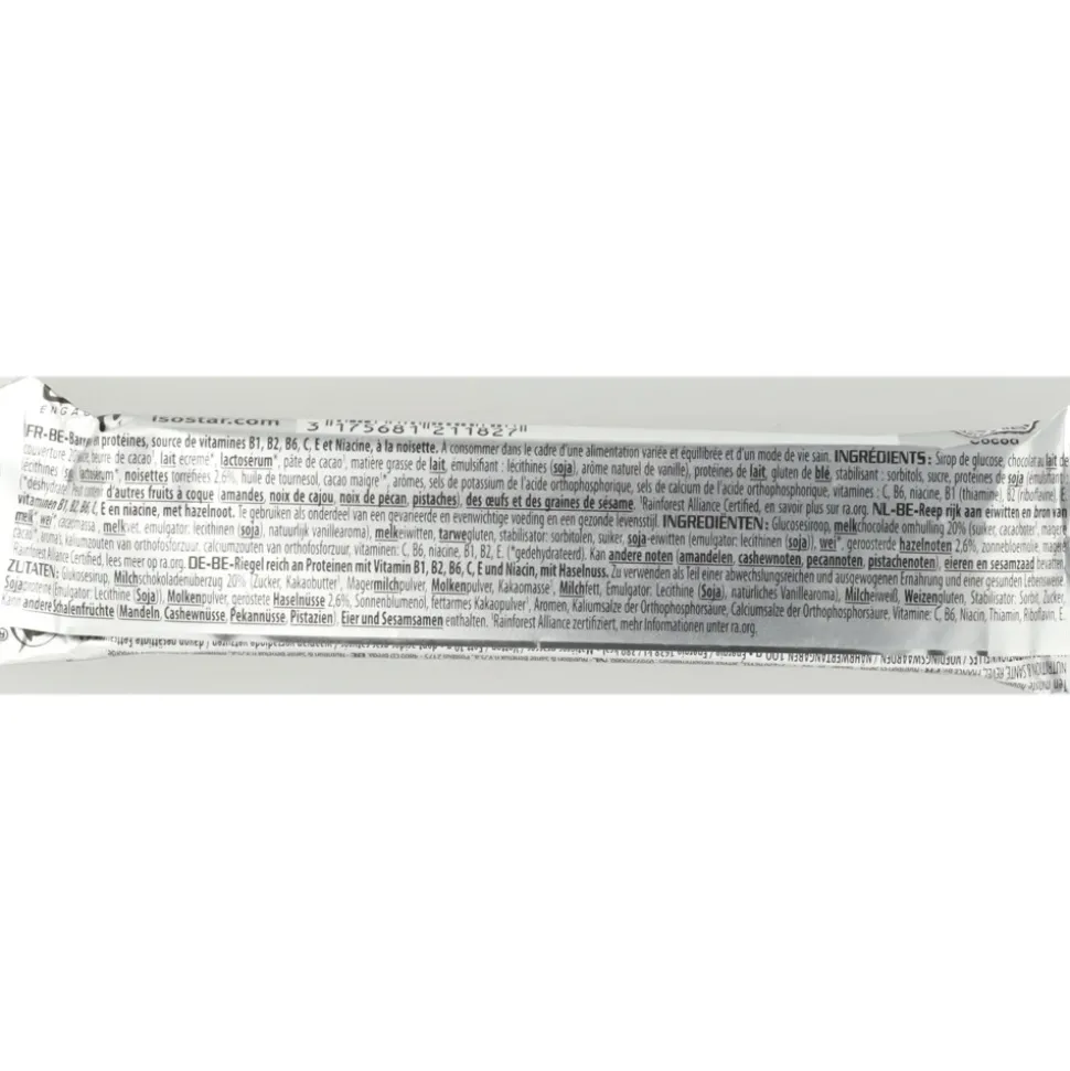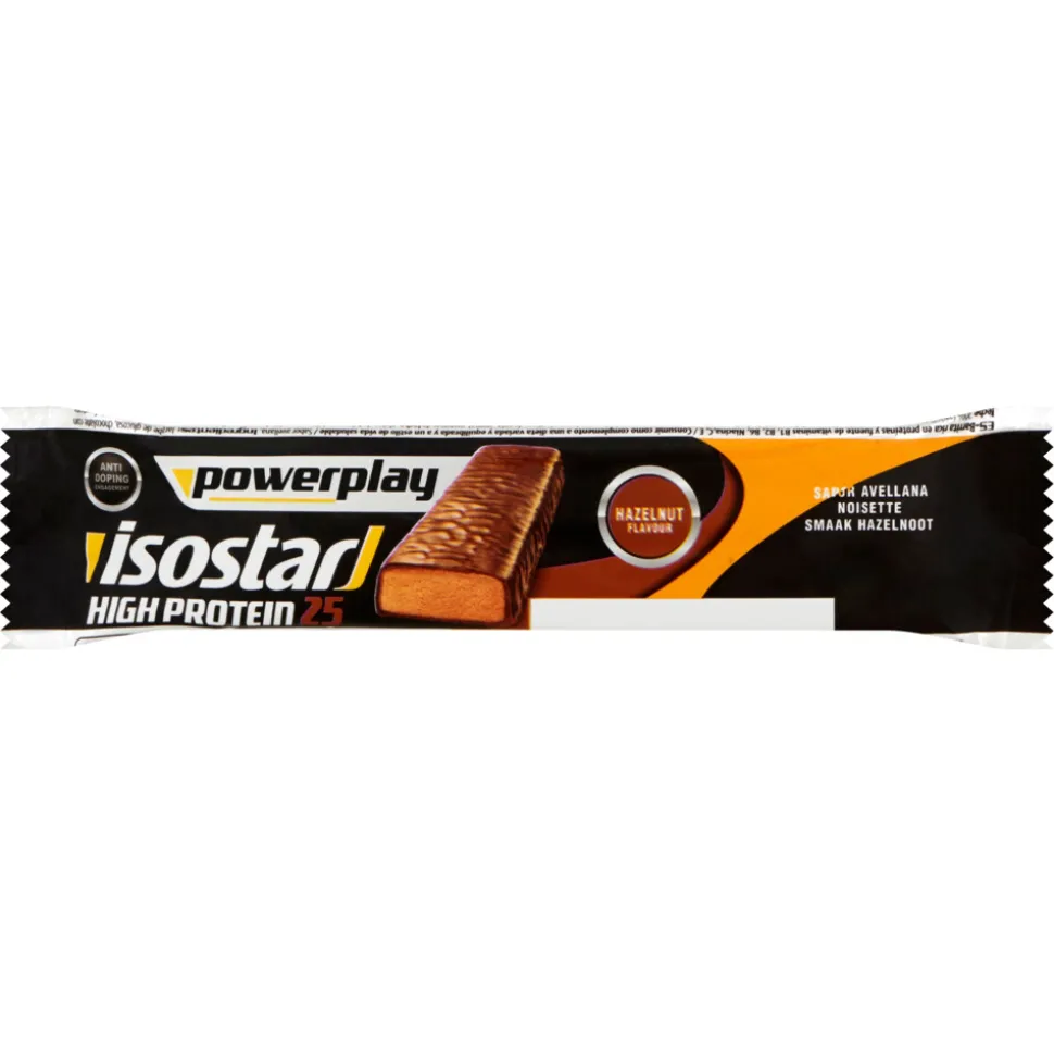 De Isostar High Proteïn Hazelnoot 25 repen leveren eiwitten die helpen om de spiermassa te behouden en op te bouwen, koolhydraten voor de energie die nodig is voor het samentrekken van de spieren, maar ook vitaminen.
