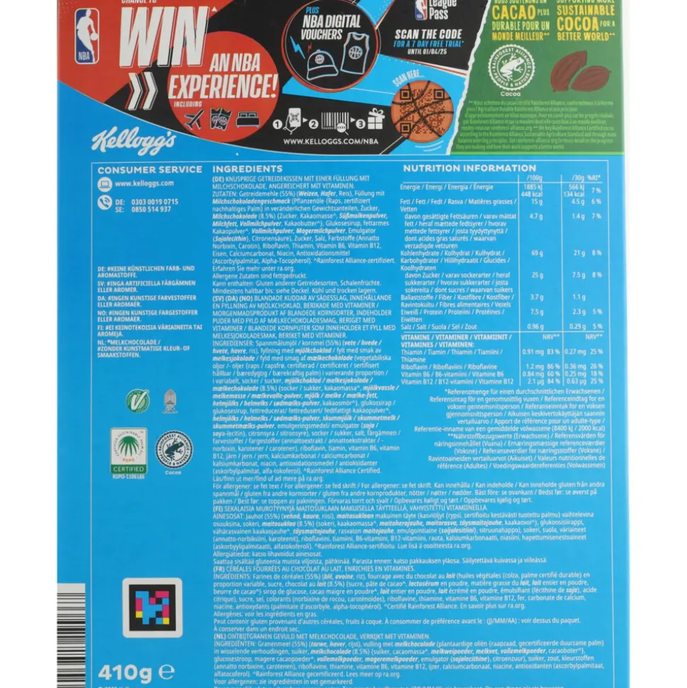 Granenmeel (55%) (TARWE, HAVER, rijst), vulling met MELKCHOCOLADE (plantaardige oliën {raapzaad, palm} in wisselende verhoudingen, suiker, MELKCHOCOLADE (8.5%) {suiker, cacaomassa, MELKWEIPOEDER, MELKVET, VOLLEMELKPOEDER, cacaoboter}, glucosestroop, magere cacaopoeder, VOLLEMELKPOEDER, MAGEREMELKPOEDER, emulgator {SOJALECITHINE}, citroenzuur), suiker, zout, kleurstoffen (annatto norbixine, carotenen), riboflavine, thiamine, vitamine B6, vitamine B12, antioxidanten (ascorbylpalmitaat, alfatocoferol).