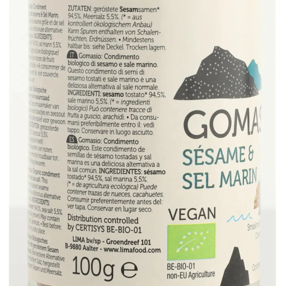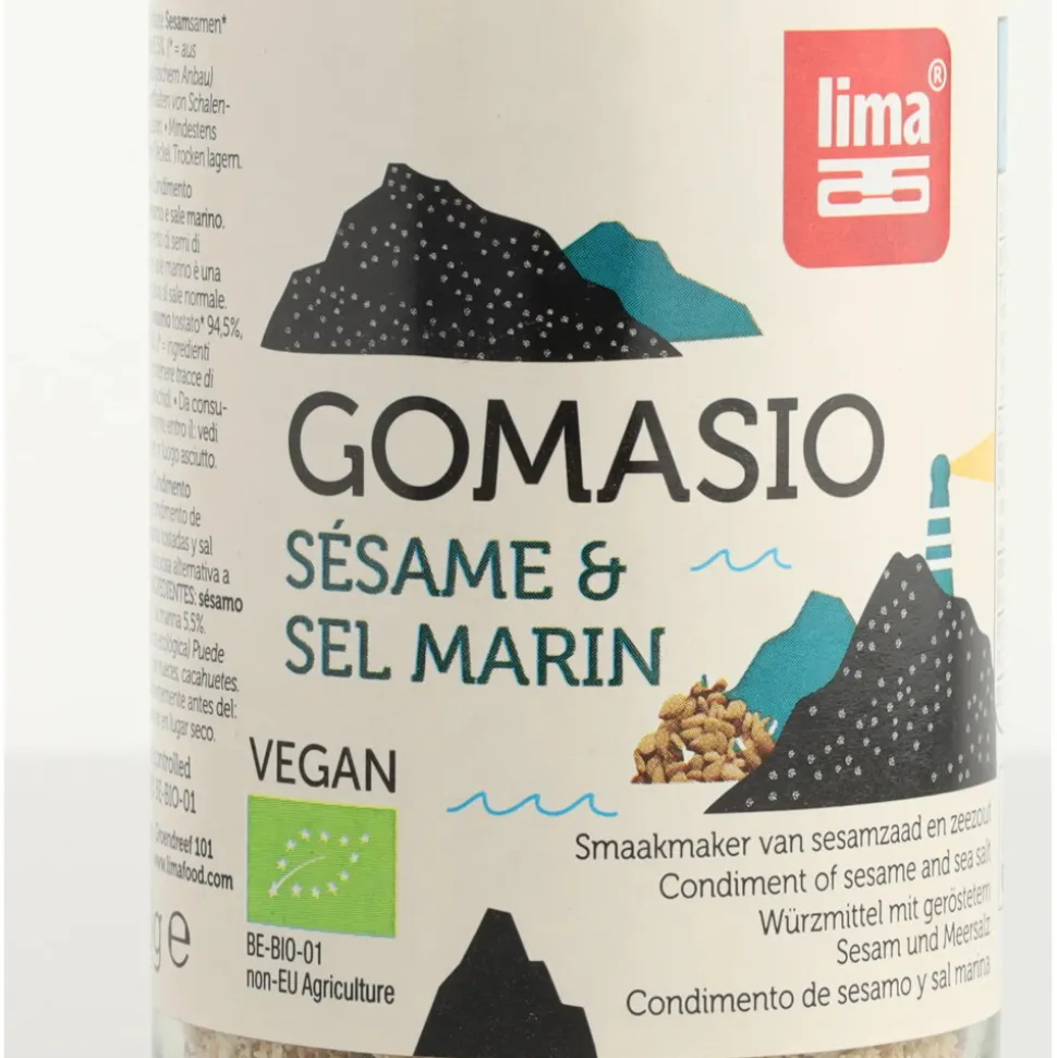 Lima Gomasio Original Strooibus, Gomasio is een Japanse specerij, gemaakt van geroosterde sesamzaadjes en ongeraffineerd zeezout (5%). De sesamzaadjes worden licht geroosterd en fijngemalen met het zout, waardoor elk zoutkorreltje wordt omhuld door sesamolie. Het is een gezonde smaakmaker met minder sodium dan traditioneel zout.