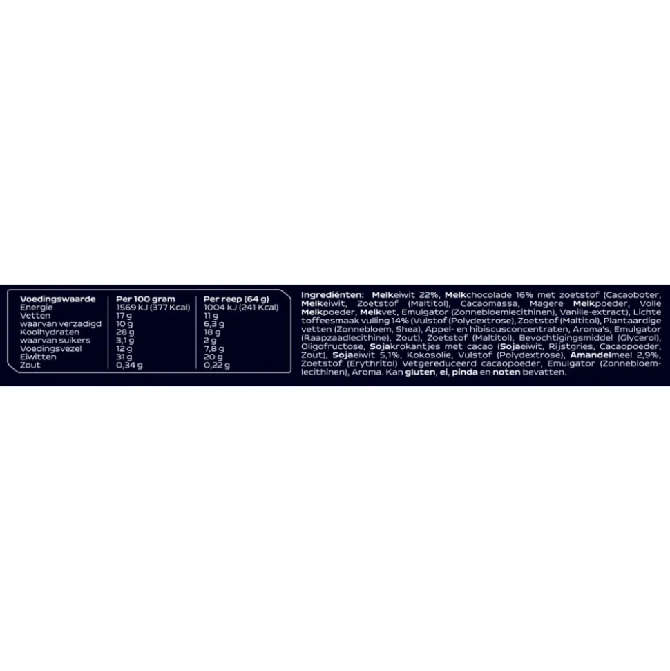 MELKeiwit (22%), MELKchocolade (16%) met zoetstof (cacaoboter, MELKeiwit, zoetstof (maltitol), cacaomassa, magere MELKpoeder, volle MELKpoeder, MELKvet, emulgator (zonnebloemlecithinen), vanille-extract), lichte toffeesmaak vulling (14%) (vulstof (polydextrose), zoetstof (maltitol), plantaardige vetten (zonnebloem, shea), appel- en hibiscusconcentraten, aroma’s, emulgator (raapzaadlecithine), zout), zoetstof (maltitol), bevochtigingsmiddel (glycerol), oligofructose, SOJAkrokantjes met cacao (SOJA–eiwit, rijstgries, cacaopoeder, zout), SOJA–eiwit (5,1%), kokosolie, vulstof (polydextrose), AMANDELmeel (2,9%), zoetstof (erythritol), vetgereduceerd cacaopoeder, emulgator (zonnebloemlecithinen), aroma.