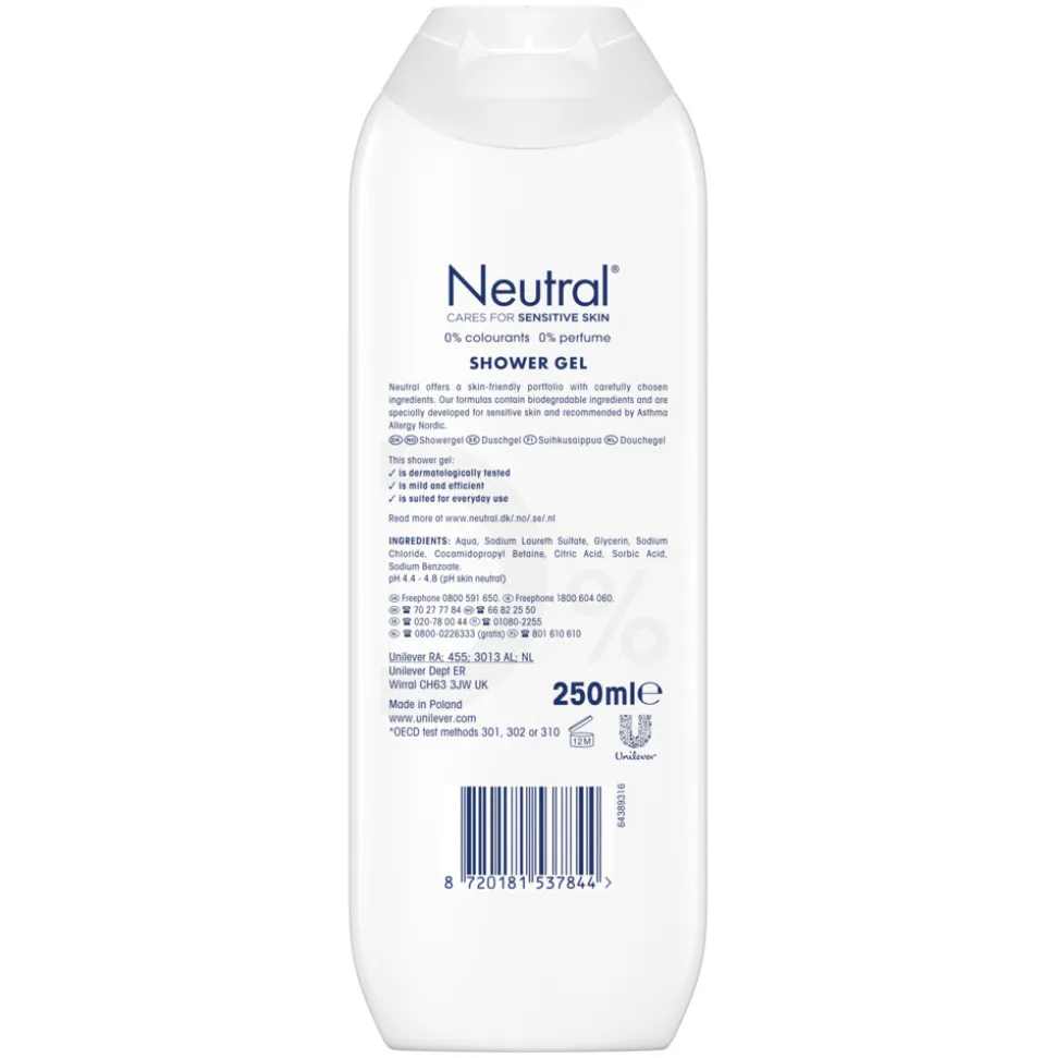Neutral 0% Parfumvrije Showergel met 0% parfum en 0% kleurstof is speciaal ontwikkeld voor de gevoelige huid en bevat 100% biologisch afbreekbare ingrediënten.