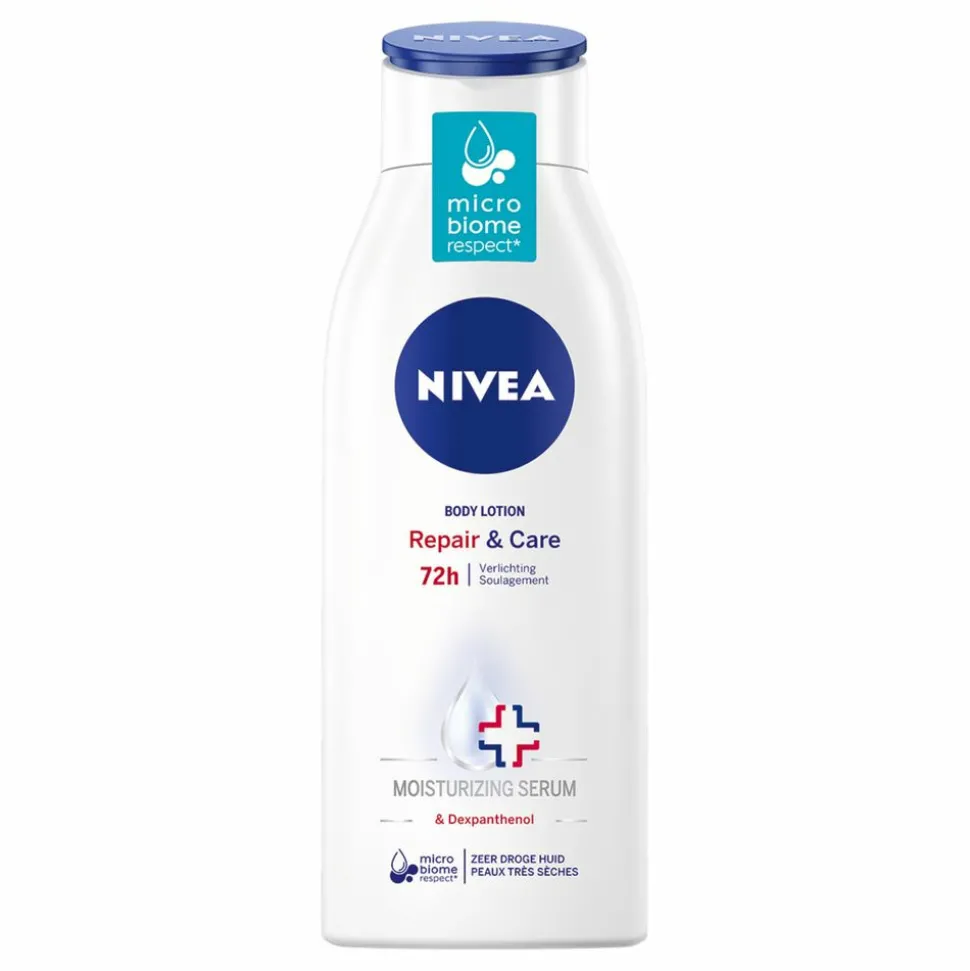Nivea Repair & Care Body Lotion zorgt voor je huid en respecteert het microbioom van de huid. Het microbioom van de huid is een natuurlijke laag bacteriën op je huid en het is belangrijk om haar mooie en gezonde uitstraling te behouden. De Body Lotion heeft geen invloed op het natuurlijke evenwicht van het microbioom. De formule behoudt, bij regelmatig gebruik, de hydraterende werking voor een merkbaar zachtere huid gedurende 72 uur. Nivea Repair & Care Body Lotion met Hydraterend Serum en Dexpanthenol versterkt de natuurlijke barrière van de huid en verzacht onmiddellijk het irritatiegevoel van de huid. Het product is geschikt voor de zeer droge huid en is ontwikkeld in saMenwerking met een dermatoloog.
