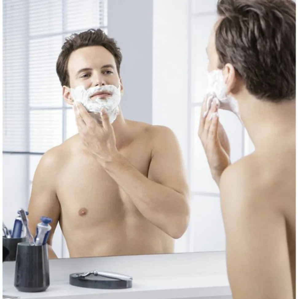 Maak het gezicht vochtig en breng een kleine hoeveelheid scheergel aan op de huid. Masseer de gel zachtjes in en scheer zoals gewoonlijk. Spoel het gezicht na het scheren af met water.