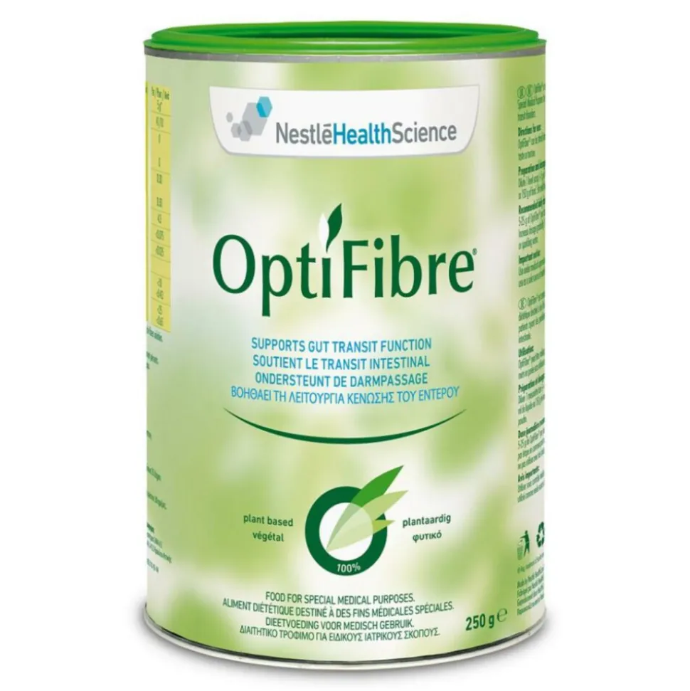 OptiFibre Voedingsvezels Supplement Neutraal is een poedervormige aanvullende dieetvoeding voor medisch gebruik, bron van 100% oplosbare vezels, gedeeltelijk gehydroliseerd guar gom (PHGG). Met OptiFibre voedingsvezels kunnen mensen die last hebben van darmpassageproblematiek zoals obstipatie (ook wel constipatie genoemd), zelf veel doen om de darmwerking gezond te houden. Dankzij de volledig oplosbare vezels wordt de natuurlijke darmwerking ondersteund.