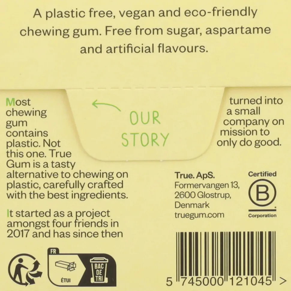 True gum Kauwgom Lemon is verfrissend en heerlijk van smaak. De zoetzure smaak van frisse citroen geeft een aangename smaak in de mond. Deze in Denemarken ontwikkelde kauwgom is vrij van palmolie, synthetisch rubber en plastic waardoor het biologisch afbreekbaar is en dus beter voor onze planeet.